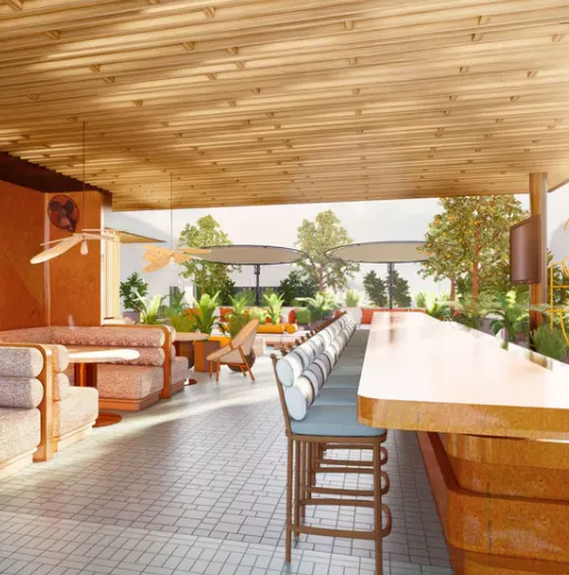 Designed with a chic, beach-club ambiance, Allegra boasts plush daybeds, shaded cabanas, and a stylish Sunset Lounge Deck. The interior features warm wood tones, desert-inspired accents, and expansive glass railings that provide unobstructed views of the city skyline. The space is designed to evoke the spirit of a classic country bar, providing a comfortable setting for patrons to enjoy their meals and drinks.