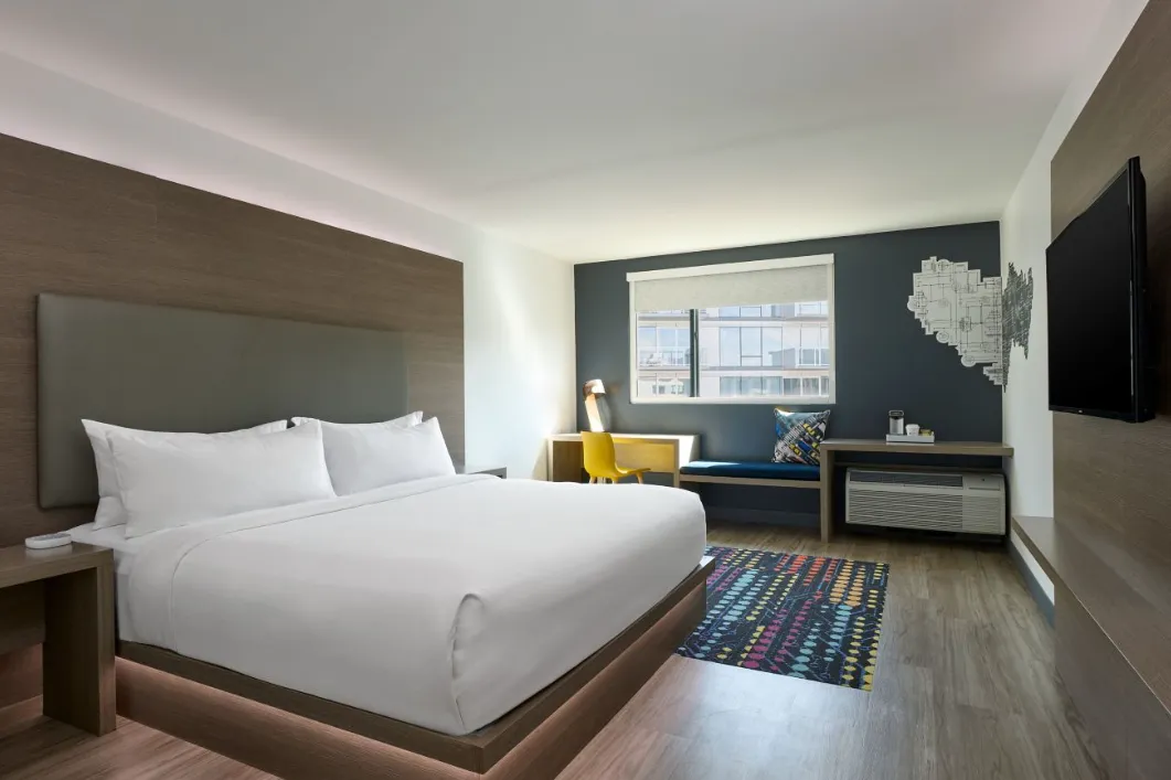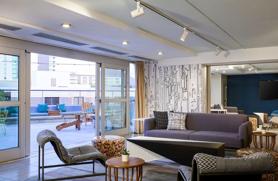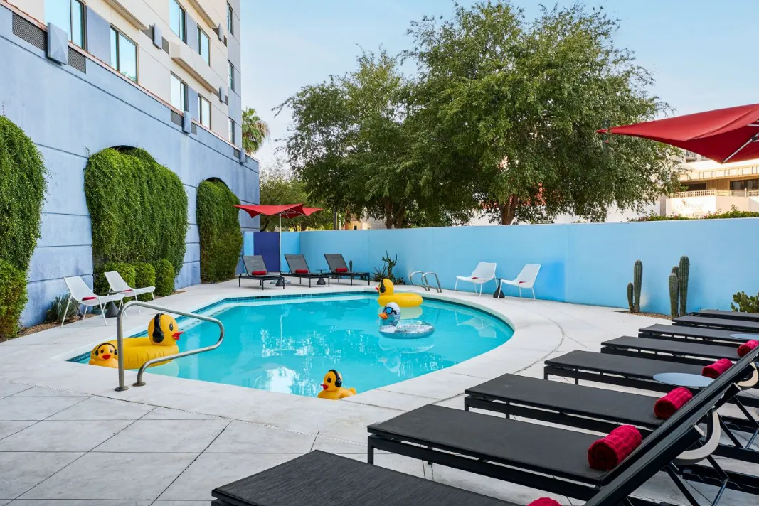 Aloft Scottsdale offers a vibrant and modern atmosphere that seamlessly blends urban sophistication with a relaxed desert charm. The hotel's design features open, loft-inspired spaces with high ceilings, clean lines, and bold pops of color, creating an energetic and inviting environment. The W XYZ bar serves as a social hub, offering craft cocktails and live music, while the Re:mix lounge provides a comfortable space for guests to unwind. The outdoor pool area is complemented by fountains and a fireplace, enhancing the hotel's appeal to young professionals seeking a dynamic yet comfortable setting.