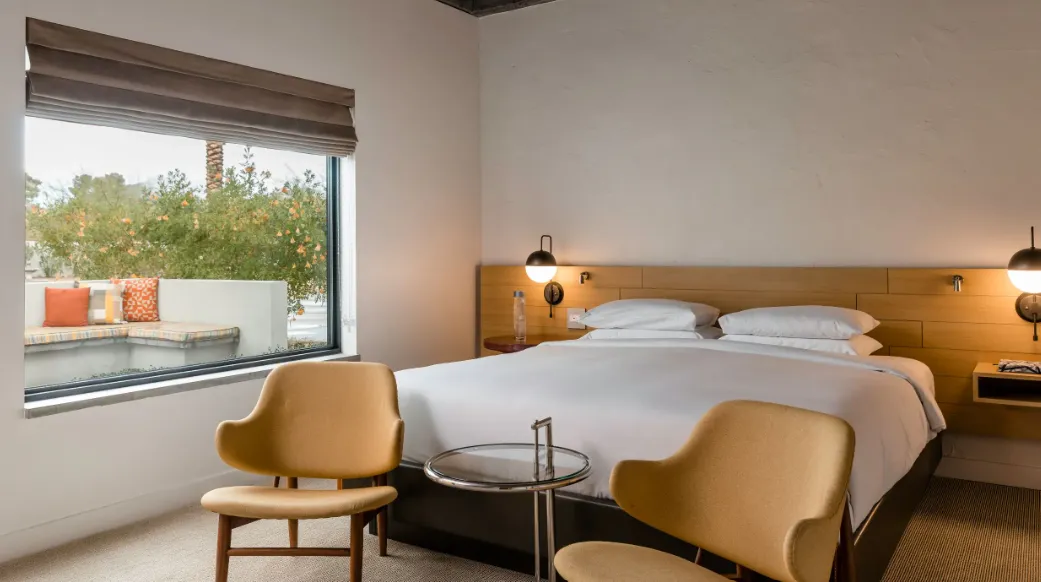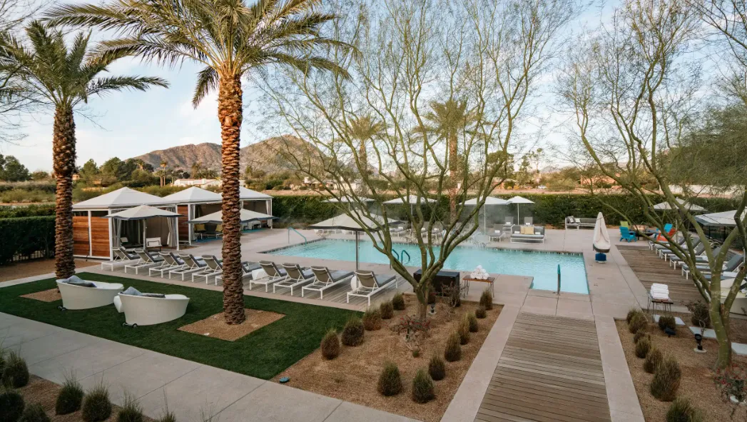 The Andaz Scottsdale Resort & Bungalows offers a distinctive atmosphere that seamlessly blends mid-century modern design with the natural beauty of the Sonoran Desert. Spread across 23 acres, the resort features 185 bungalow-style accommodations, each adorned with locally crafted furnishings and artwork inspired by mid-century design icons like Alexander Girard and Charles and Ray Eames.