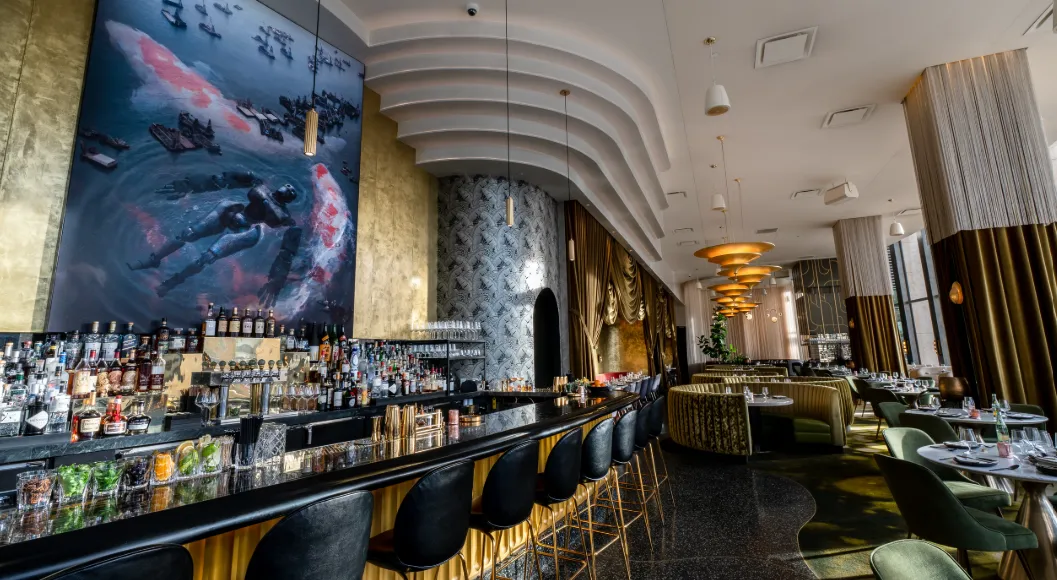 Animae in San Diego offers an immersive dining experience that fuses opulent Art Deco elements with the ethereal beauty of Japanese zen gardens. Designed by Bells + Whistles, the restaurant's 7,600-square-foot interior evokes the mossy forests of Yakushima Island, featuring a jewel-toned palette of emerald, gold, and salmon. Serpentine velvet booths line bespoke wool carpeting, while meandering terrazzo "rivers" flow through the space, enhancing the naturalistic ambiance. The 20-foot ceilings are adorned with minaret-style chandeliers, and central columns anchor the expansive room. A striking mural of a giant robot floating in a koi pond adds a whimsical touch above the bar, juxtaposing traditional and futuristic aesthetics. The overall design creates a theatrical, dreamlike environment that transports guests into an enchanted forest, setting the stage for a unique dining adventure.