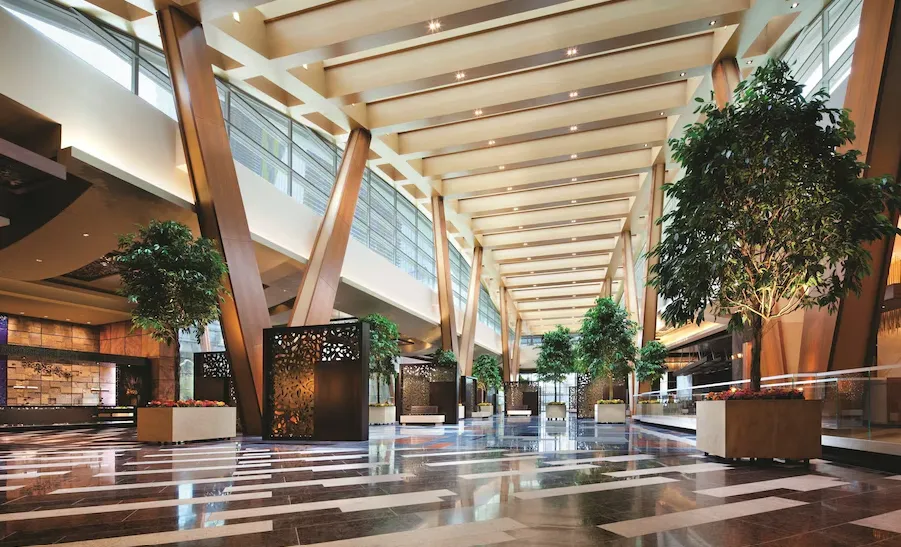 ARIA Resort & Casino offers an atmosphere that blends sleek modernity with understated luxury, creating a serene yet vibrant escape in the heart of the Las Vegas Strip. Its design features two sweeping glass towers with curvilinear architecture that allow natural light to flood spacious interiors. Inside, the aesthetic is defined by clean lines, polished stone floors, contemporary art installations, and expansive open spaces accented with lush greenery and ambient lighting. The resort balances high-tech sophistication—such as rooms with touchscreen controls for lighting and climate—with calming design elements, resulting in an environment that feels both futuristic and welcoming. The overall effect is a harmonious fusion of elegance, innovation, and comfort.