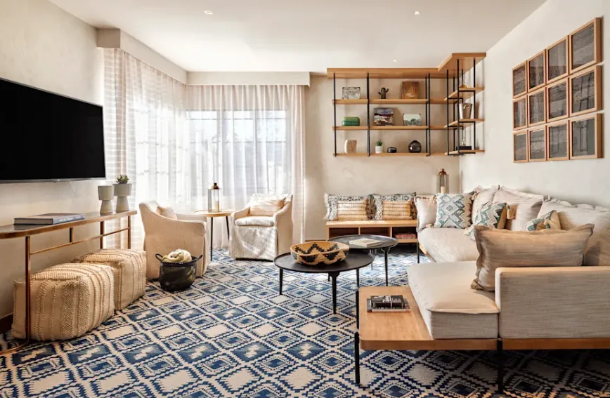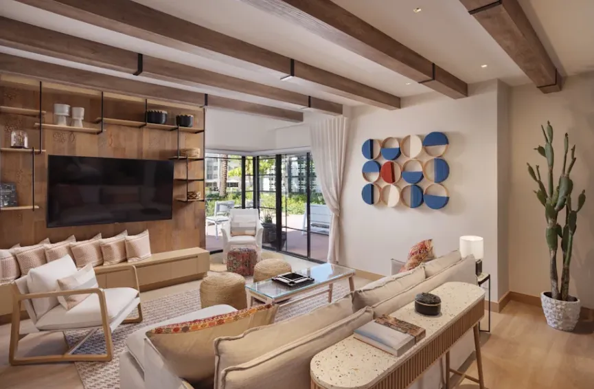Designed by Albert Chase McArthur with Wright's guidance, the resort features the distinctive "Biltmore Block"—a geometric pattern said to represent a freshly cut palm tree—integrated into its design. The interior spaces are characterized by earthy tones, luxurious furnishings, and intricate geometric patterns that evoke a sense of timeless sophistication. Notable elements include the grand Gold Room with its gold leaf ceiling, the Aztec Room adorned with copper beams, and the iconic Catalina Pool, favored by Hollywood legends.