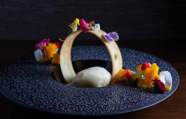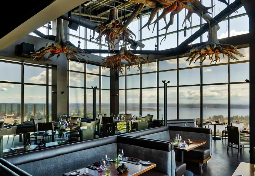 The restaurant's design combines contemporary elegance with natural elements, featuring floor-to-ceiling windows, sleek furnishings, and a warm color palette. Guests can choose from various dining areas, including the main dining room, sushi bar, lounge, and private suites, each offering unique views and ambiance. The lounge area, with its cozy seating and fireplace, provides a relaxed setting for cocktails and small plates.