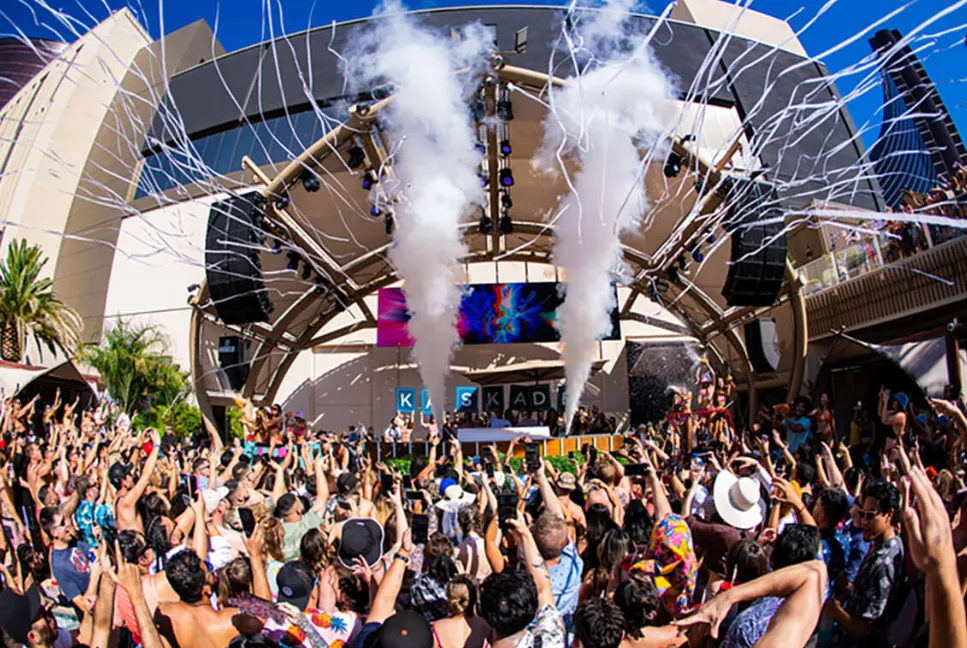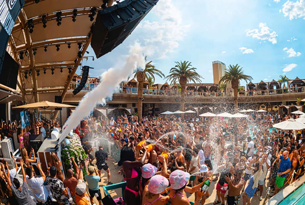 Ayu Day Club, located at Resorts World Las Vegas, offers a tropical oasis inspired by Southeast Asia's idyllic islands. Spanning 41,000 square feet, the venue features lush greenery, sparkling pools, and a vibrant atmosphere that transports guests to a Bali-inspired retreat.