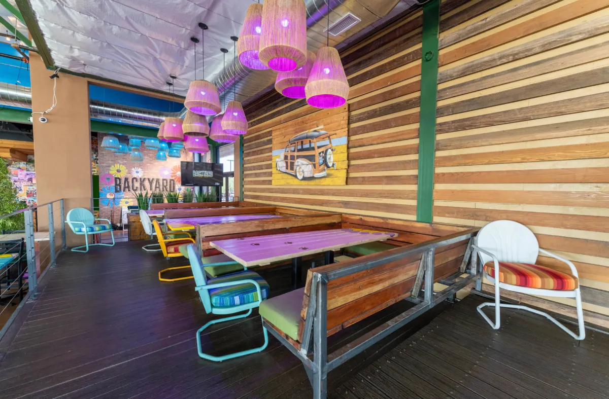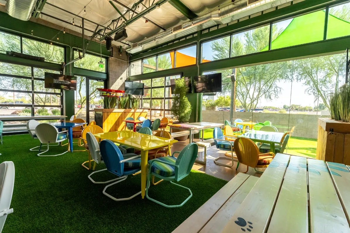 Backyard Gilbert has a vibrant, energetic atmosphere that combines casual comfort with a fun, social vibe. The interior features an open-layout design with a mix of high-top tables, booths, and communal seating, creating spaces that accommodate both small groups and larger gatherings. Warm lighting, rustic wood accents, and modern décor give the space a welcoming yet lively feel, while the expansive outdoor patio adds a relaxed, airy element perfect for enjoying Arizona’s weather. Large HD TVs and LED walls throughout the venue enhance the game-day energy, and live music or DJ setups bring an added layer of excitement in the evenings. Overall, the design encourages socializing and entertainment while maintaining a comfortable, approachable environment for all guests, including dog owners on the patio.