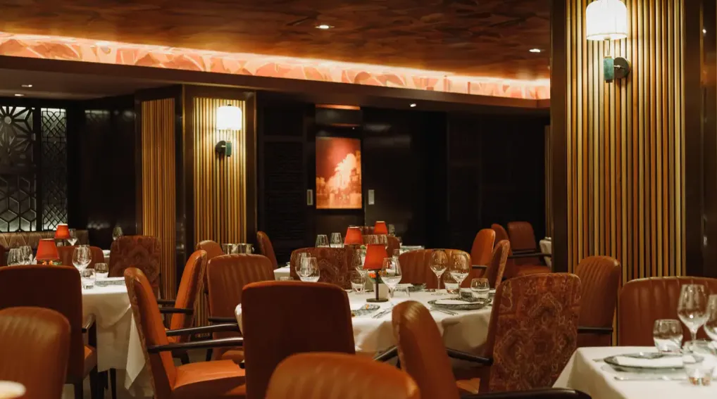 Benares London offers an atmosphere of refined elegance that perfectly complements its Michelin-starred Indian cuisine. The interior blends contemporary sophistication with subtle Indian influences, creating a warm yet luxurious dining environment. Rich, dark wood paneling, soft ambient lighting, and plush seating combine with intricate accents such as hand-crafted screens and elegant artwork to evoke a sense of timeless opulence. The layout is designed for both intimacy and comfort, with private dining spaces and a main dining room that maintains a serene, relaxed energy despite its central London location. The overall design creates a setting that feels both exclusive and welcoming—ideal for fine dining, special celebrations, or sophisticated gatherings.