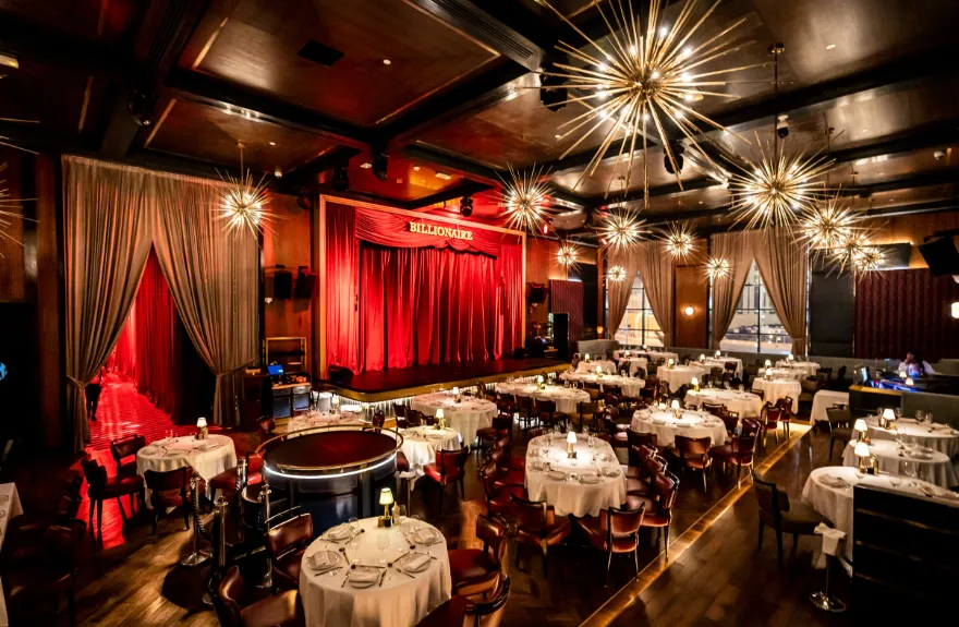 Billionaire Dubai boasts a lavish interior characterized by opulent furnishings, dramatic lighting, and a dynamic ambiance that evolves from a refined dining setting to an electrifying nightclub atmosphere. The venue's design reflects its commitment to luxury and sophistication, creating an immersive environment where guests can enjoy both intimate dinners and high-energy nightlife.