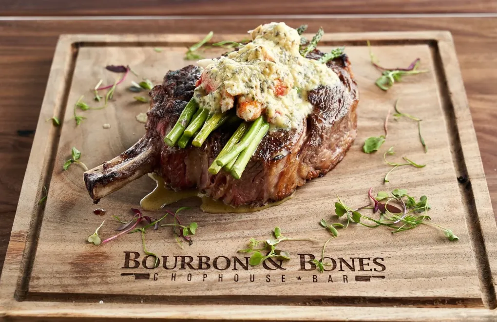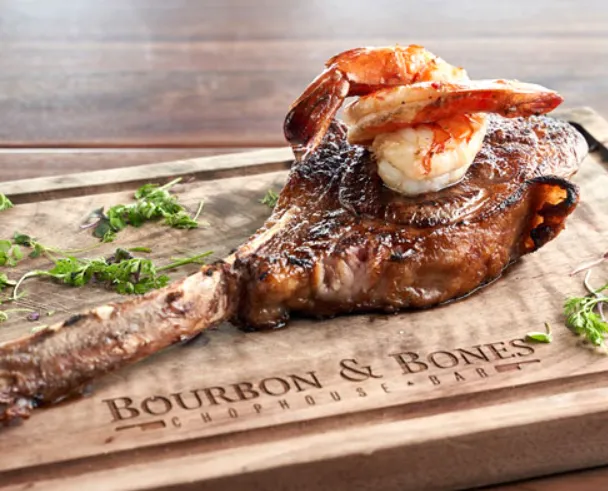 Bourbon & Bones Chophouse and Bar in Old Town Scottsdale offers a contemporary fine dining experience, blending upscale steakhouse traditions with a vibrant, modern atmosphere. The restaurant features USDA Prime and Wagyu steaks, fresh seafood, and an extensive selection of over 600 bourbons and whiskeys.