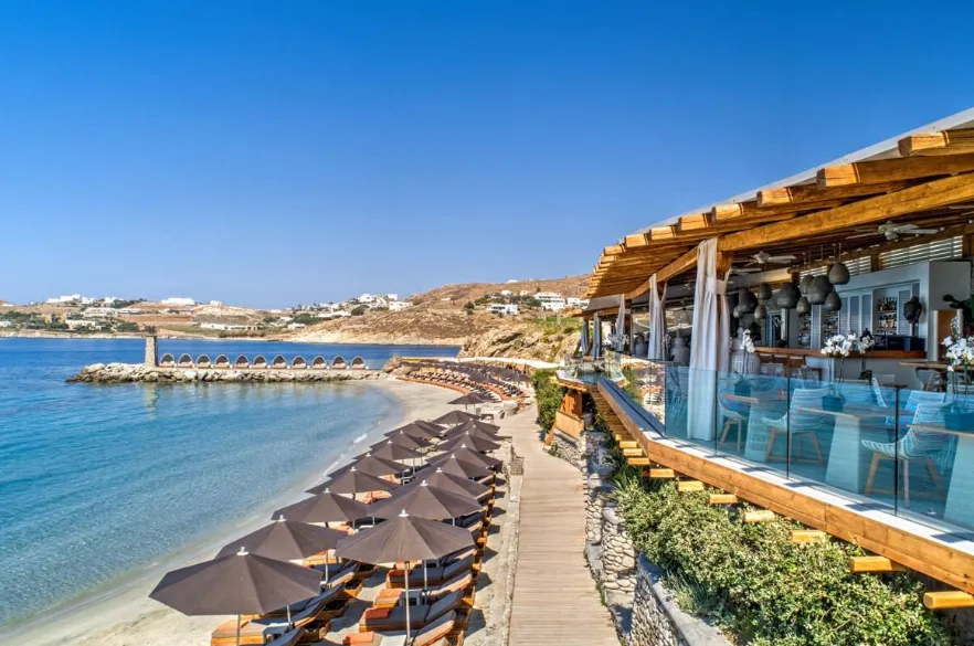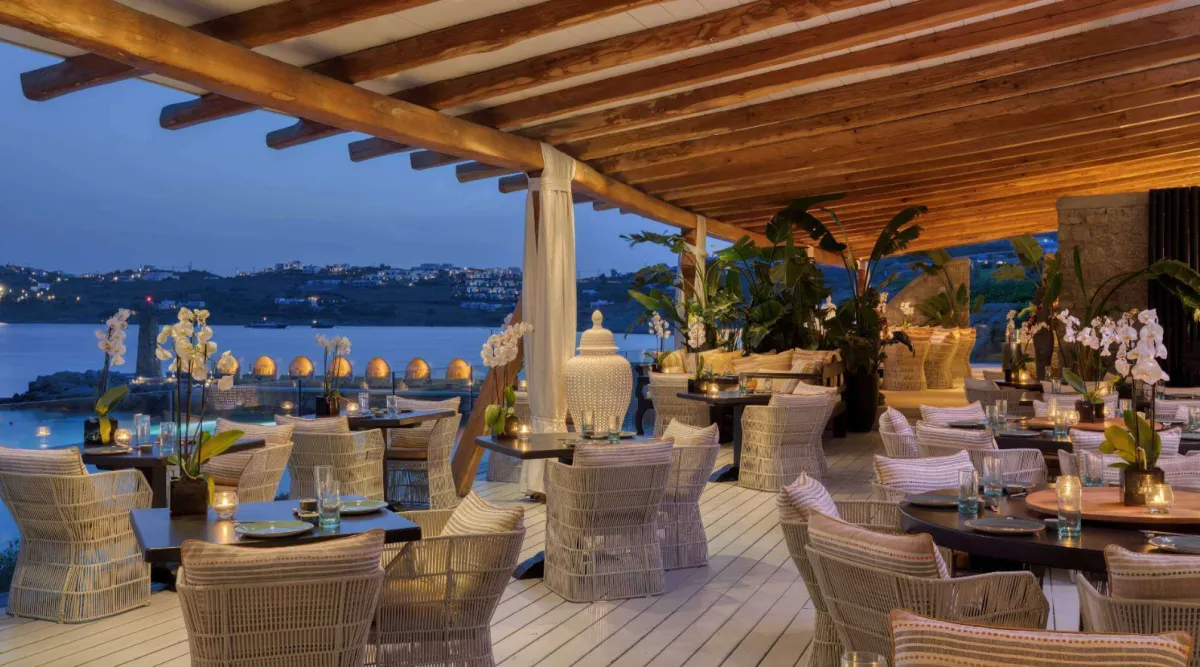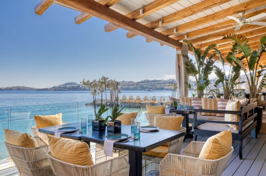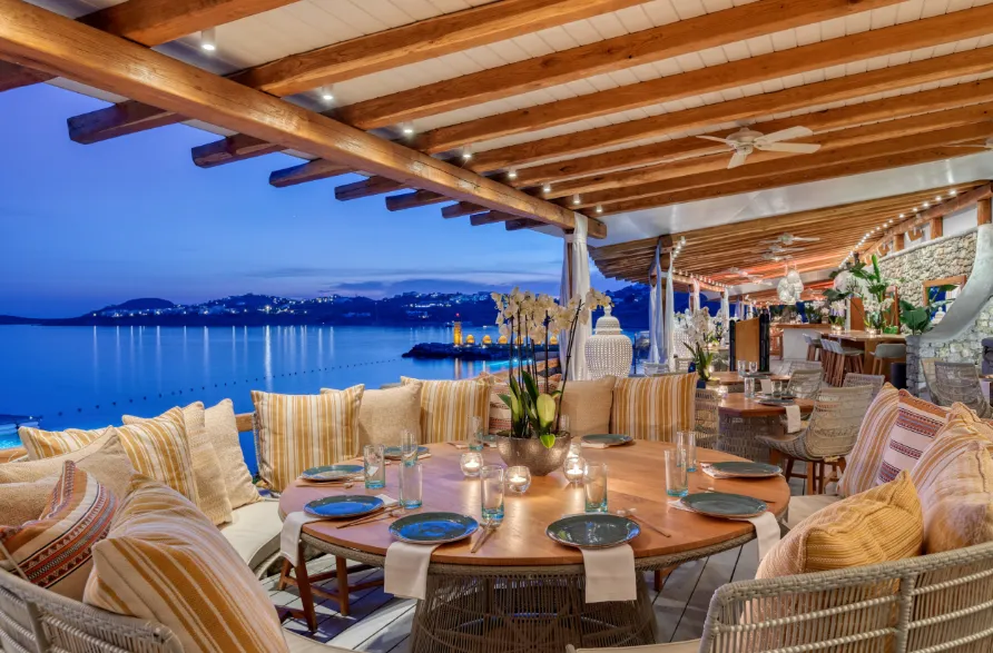 Perched above Santa Marina’s private beach, Buddha-Bar Beach Mykonos boasts a chic, open-air design that blends traditional Greek architecture with exotic Asian influences. The space features elegant furnishings, soft lighting, and panoramic views of the Aegean Sea, creating an inviting environment for both daytime relaxation and evening entertainment.