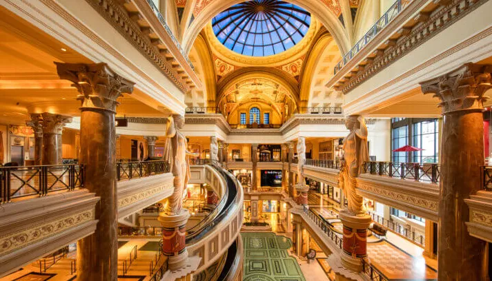 Caesars Palace Las Vegas offers an atmosphere of grand opulence inspired by the glory of ancient Rome, blending classic elegance with modern luxury. The resort’s design features majestic marble columns, intricate mosaics, sculpted fountains, and statues reminiscent of Roman emperors and gods, creating a theatrical and immersive environment. Expansive courtyards, lush gardens, and ornate archways lead guests through a world of timeless sophistication, while contemporary touches—such as sleek interiors in guest rooms and high-end lounges—add a modern flair. The overall ambiance is both extravagant and inviting, delivering a dramatic yet comfortable experience that feels like stepping into a modern palace.