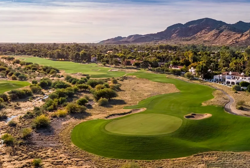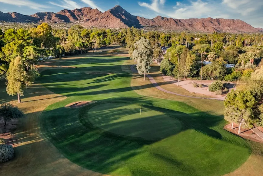 Camelback Golf Club in Scottsdale offers a premier desert golf experience across two distinct 18-hole courses set against the striking backdrop of Mummy and Camelback Mountains. The Ambiente Course, designed by Jason Straka, features a traditional American links-style layout with rolling fairways, dramatic elevation changes, strategic bunkering, and native desert vegetation that create a sustainable, Northern desert aesthetic. In contrast, the Padre Course, designed by Arthur Hills, delivers a parkland-style experience with tree-lined fairways, lakes, and challenging bunkers, blending natural beauty with thoughtful strategy. Both courses offer a serene yet challenging atmosphere that harmonizes world-class design with the rugged beauty of the Sonoran Desert.