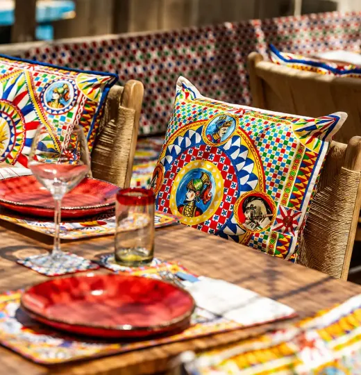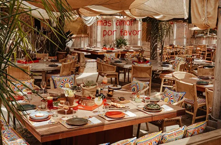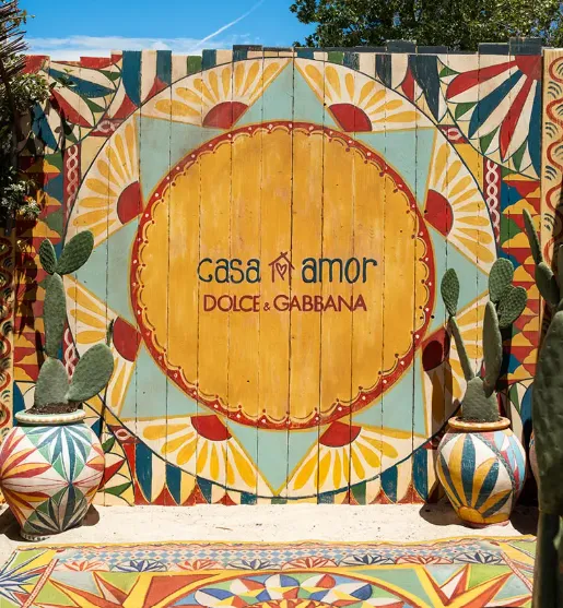 Casa Amor in Saint-Tropez offers a vibrant and eclectic atmosphere that seamlessly blends Mediterranean elegance with bohemian flair. Inspired by the laid-back charm of Tulum, the beach club features natural materials like wood and burlap, complemented by vibrant colors and intricate patterns. The space is adorned with Dolce&Gabbana's iconic Carretto Siciliano motifs, adding a touch of Sicilian heritage to the design. Guests can enjoy a festive ambiance under shaded cabanas, surrounded by lush greenery and the soothing sounds of live DJs. The overall aesthetic creates a warm and inviting environment, making Casa Amor a chic and memorable destination on Pampelonne Beach.