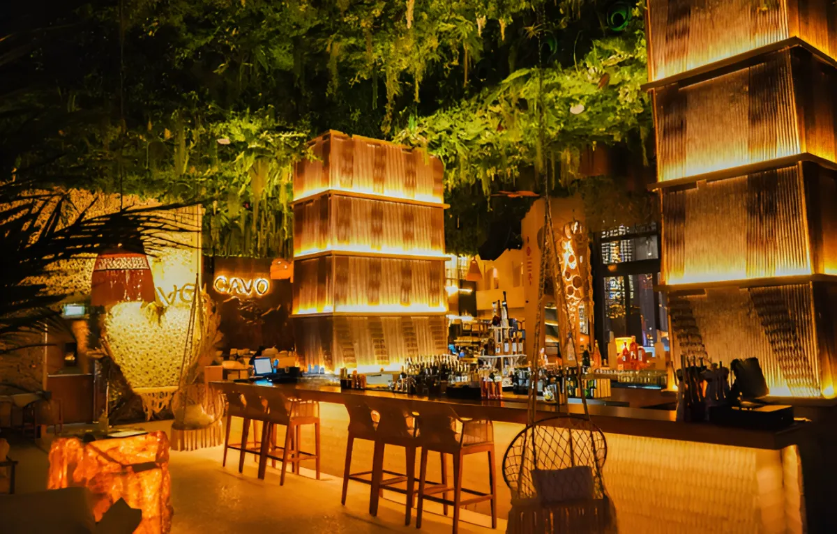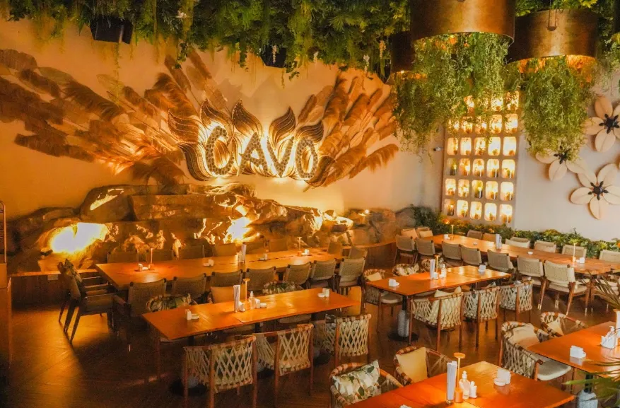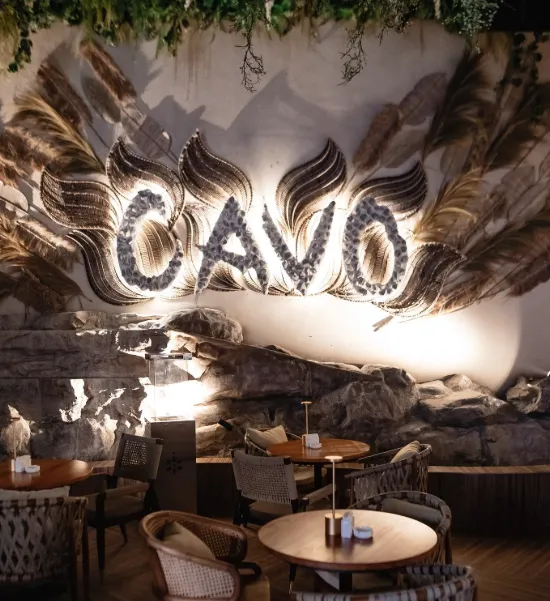The interior of Cavo is designed to create a cozy yet luxurious ambiance, featuring warm lighting, elegant furnishings, and artistic décor. The venue's design aims to provide a comfortable setting for guests to enjoy their meals and socialize, with a layout that transitions seamlessly from dining to dancing as the night progresses.