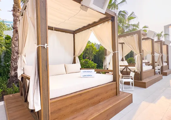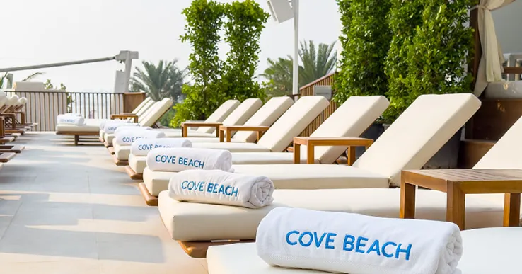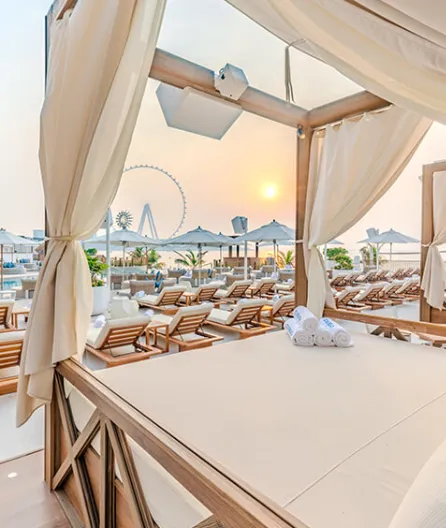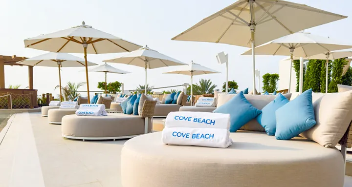 Cove Beach Dubai is a chic beachfront destination located at Caesars Palace on Bluewaters Island, offering a blend of Mediterranean elegance and vibrant energy. The venue features plush loungers, three pools, and a private beach, providing a luxurious setting for relaxation and socializing. Its design incorporates contemporary elements with a relaxed atmosphere, creating a sophisticated yet inviting environment.