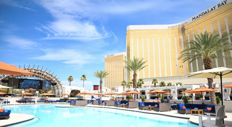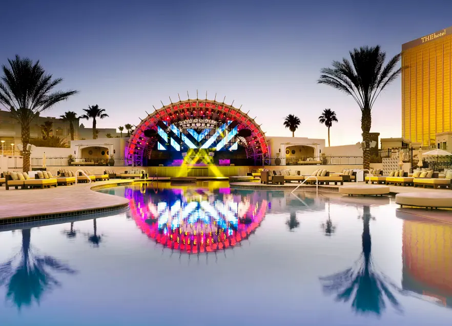 The atmosphere and design of Daylight Beach Club at Mandalay Bay combine vibrant energy with a sleek, luxurious aesthetic, creating one of Las Vegas’s most dynamic daytime destinations. The space is open and expansive, centered around a massive main pool surrounded by plush loungers, shaded daybeds, and private cabanas, offering both social and intimate spaces. Modern architecture meets tropical elegance, with clean lines, bold pops of color, and chic décor accented by palm trees and shimmering water features. During the day, the atmosphere is electric yet relaxed, filled with sunshine, pulsing music, and the hum of conversation, while themed events and high-energy DJ performances transform the club into a lively social hub where design and atmosphere blend seamlessly into a premier party experience.