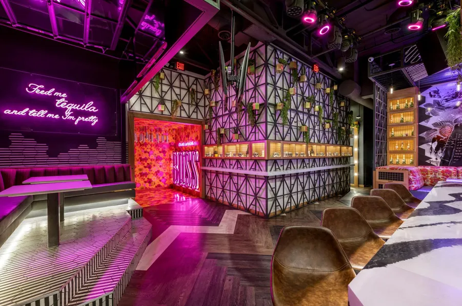 Modern-Mexican fusion: Rustic reclaimed wood, industrial black steel, and hot‑pink accent lighting create a bold, edgy soundtrack for the visual vibe. Fiesta all day & night: Known for “Super Sundays” and themed nights, it buzzes with social energy—full of dancing, bottle service, and live entertainment .