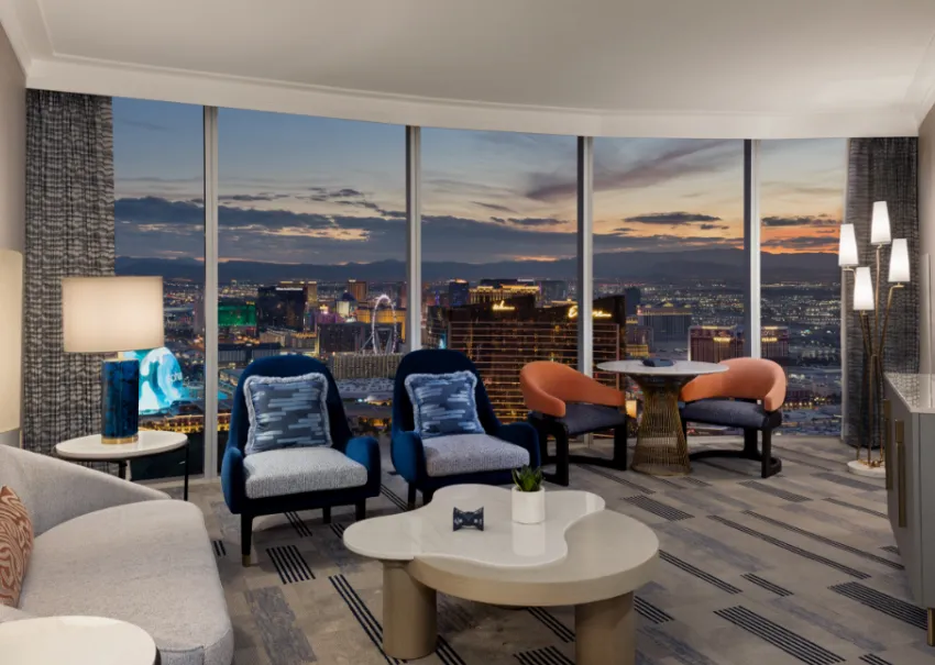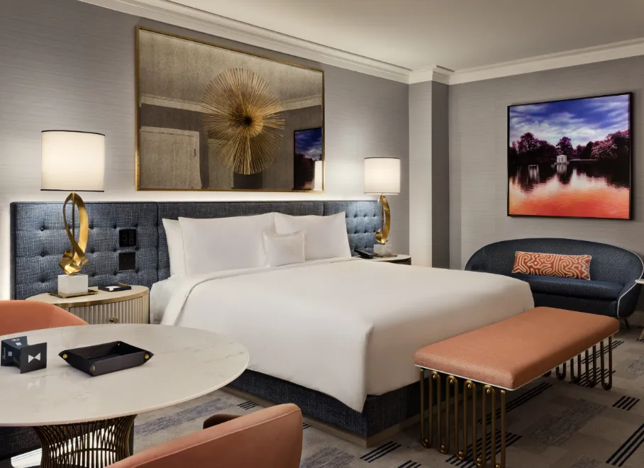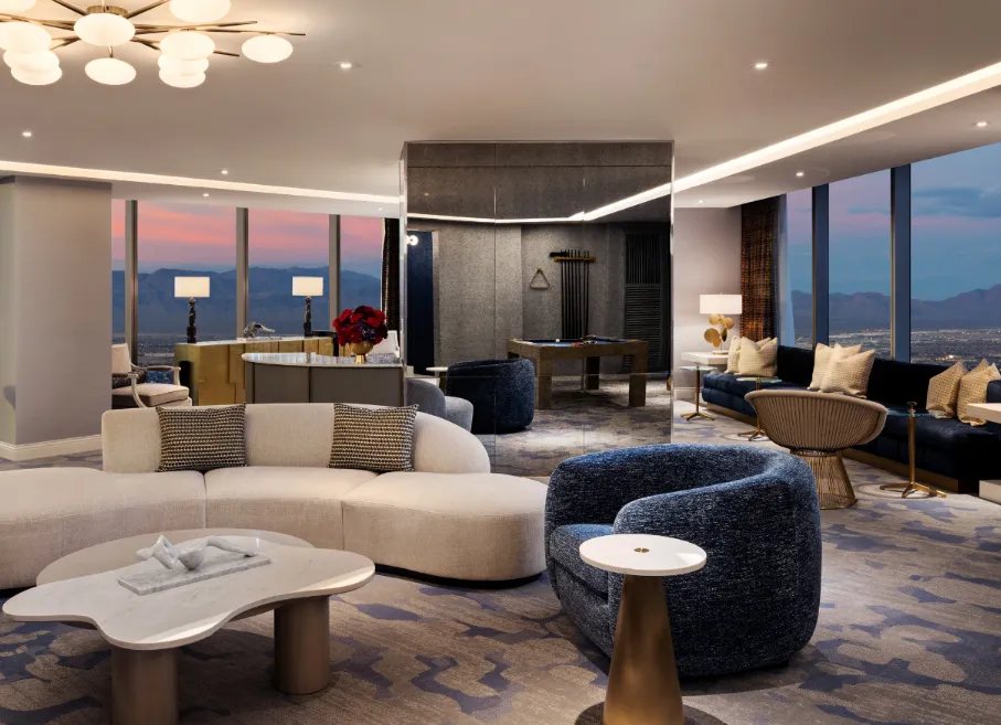 Fontainebleau Las Vegas exudes a modern, cosmopolitan atmosphere that blends luxury with bold architectural vision. Its soaring 67-story glass tower creates a striking presence on the Strip, while inside, expansive spaces are filled with light, art, and sophisticated design. The interiors feature sleek lines, rich textures, and a palette of soft neutrals accented by vibrant art installations, creating a balance between elegance and contemporary flair. Plush lounges, dramatic lighting, and immersive public spaces foster an energetic yet refined ambiance. The design seamlessly merges comfort and spectacle, offering guests a dynamic environment that feels both cutting-edge and welcoming.