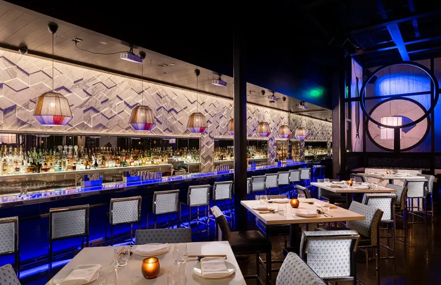 Hakkasan Las Vegas boasts a sleek, modern atmosphere that blends luxury dining with an energetic nightlife vibe. Spanning two floors inside the MGM Grand, its design—crafted by Gilles & Boissier—features dramatic lighting, carved wooden latticework, and a signature deep-blue color palette that creates an intimate yet vibrant mood. The space includes semi-private booths, ambient lighting, and elegant décor that evoke both sophistication and exclusivity. The overall effect is a fusion of high-end Cantonese dining with the dynamic pulse of a chic nightclub, making it as much a sensory experience as a meal.