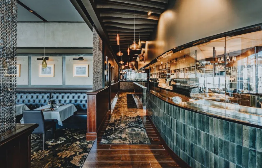 Halls Chophouse Nashville offers a sophisticated dining experience that seamlessly blends Southern elegance with modern design elements. Located in the Broadwest development, the restaurant features expansive glass curtain walls, providing diners with panoramic views of the city's skyline. The interior design incorporates dark wood millwork, sapele mahogany bar tops, and cork-wrapped columns, evoking a sense of warmth and tradition. Custom jewel box wine displays and hexagonal mosaic tiles add a touch of refinement, while Italian Murano glass fixtures introduce a luxurious feel to the space. An open kitchen, surrounded by curved glass walls, allows guests to observe the culinary process, enhancing the dining experience. The layout includes multiple dining rooms, lounge areas, and two ample bar spaces, all designed to maximize the limited square footage and minimize the visibility of service areas, ensuring a seamless and intimate atmosphere.