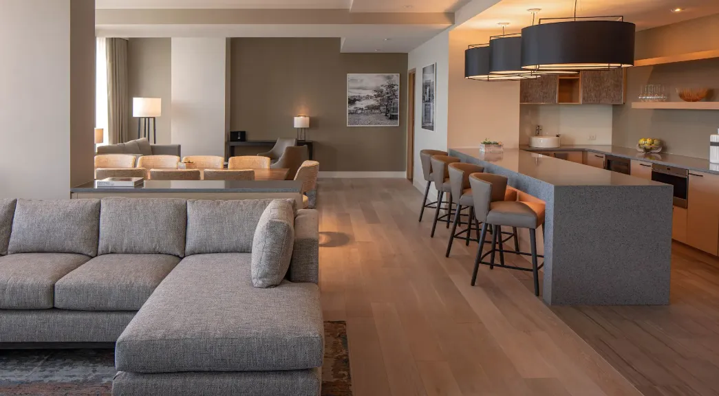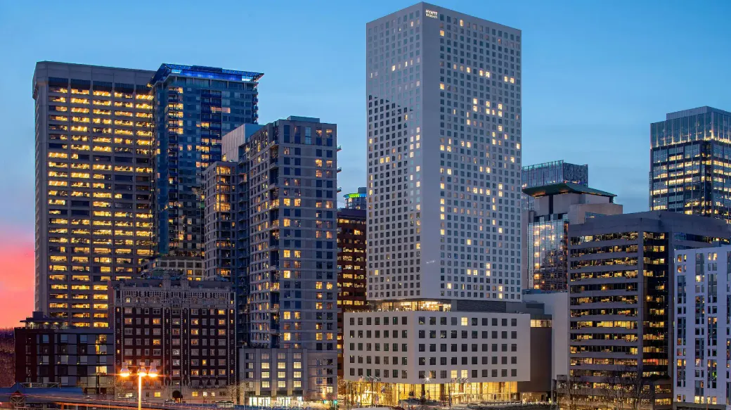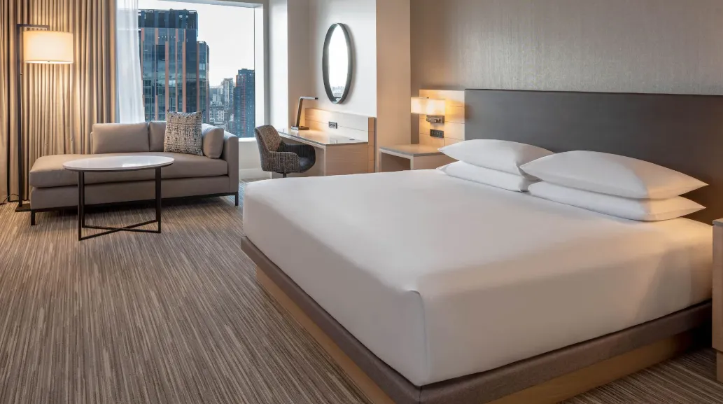 The Hyatt Regency Seattle presents a striking blend of contemporary design and regional inspiration, creating an inviting atmosphere that reflects the Pacific Northwest's natural beauty. Designed by LMN Architects, the hotel's architecture features a minimalist exterior with polished white concrete panels and structural glass walls, emphasizing transparency and openness. The lobby welcomes guests with a "cloak of warm light," achieved through a multi-layered lighting approach, including custom chandeliers and subtle illumination at the reception desk, guiding guests seamlessly to the welcoming hotel staff. Interior spaces are adorned with artworks by local photographers and large-scale pieces by artists like Cecily Brown and Michael Heizer, adding a cultural touch to the environment. The design incorporates elements inspired by the region, such as ceiling tiles in the lobby that mimic the reflection of sunlight on water and textured wood walls in hallways, celebrating the area's natural aesthetics. Overall, the Hyatt Regency Seattle offers a sophisticated and culturally rich environment, blending modern architectural elements with regional influences to provide a memorable guest experience.