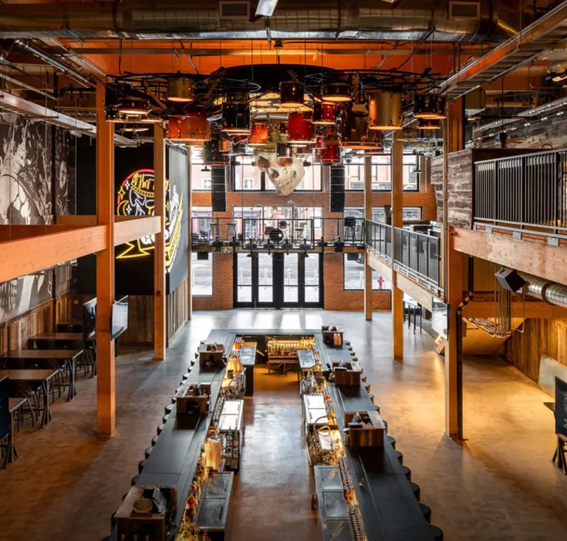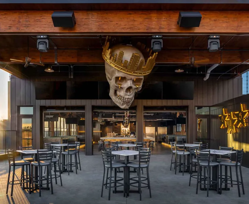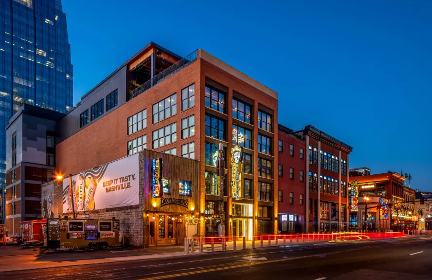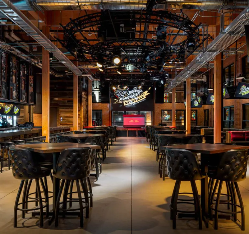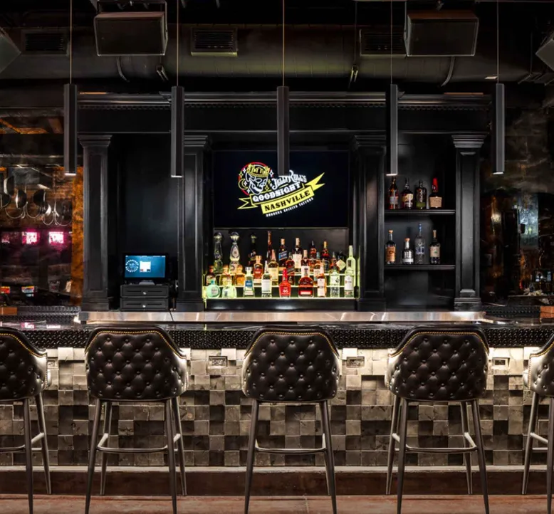 Jelly Roll’s Goodnight Nashville is a vibrant, multi-level live music venue and bar that blends rock-and-roll energy with thoughtful, artistic design. Spanning four floors, it offers distinct atmospheres: a lively main floor with a full bar and live performances beneath a rotating skull chandelier; a sultry second floor with plush booths, DJs, and art tributes; an upscale speakeasy-style third floor called “Buddy’s” for craft cocktails and private events; and the highest rooftop bar on Broadway, featuring sweeping city views and an indoor/outdoor experience. The venue’s design incorporates warm mass timber and industrial accents, creating an immersive space that celebrates Nashville’s nightlife and Jelly Roll’s unique artistic vision.