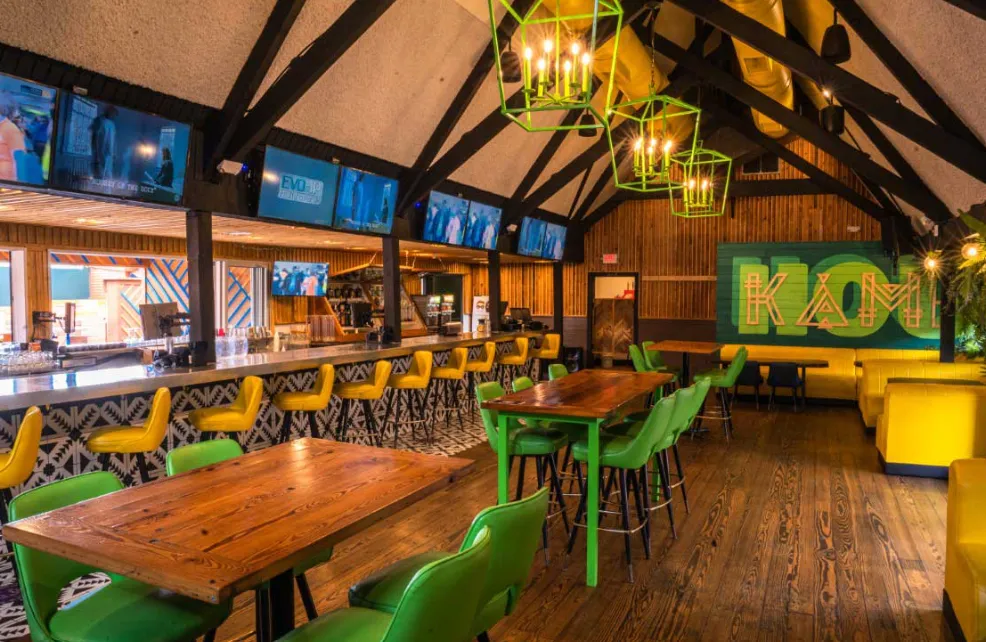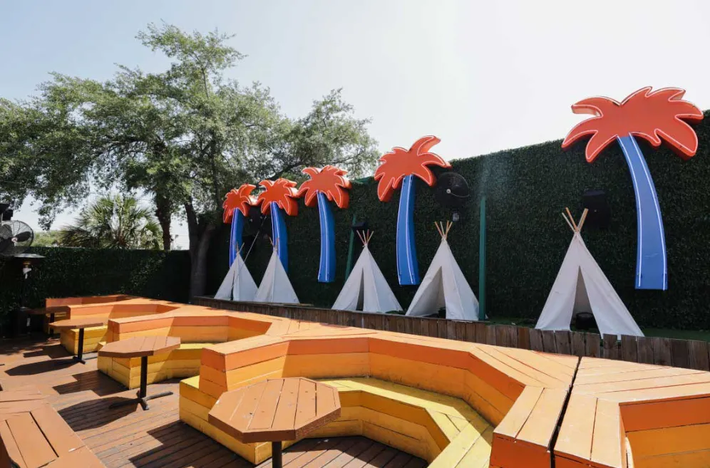 Kamp Houston's atmosphere is a vibrant fusion of playful camp-inspired motifs and upscale dining elements, creating a dynamic setting that appeals to a diverse crowd. The interior boasts bold lime green and lemon yellow hues, with green chandeliers and bright yellow booths, setting a lively tone. The space is designed to evoke a sense of fun and energy, reminiscent of a stylish summer camp retreat. The outdoor area enhances this ambiance with a fire pit surrounded by large wooden booths, a DJ booth, and large TVs, making it a popular spot for social gatherings and events.