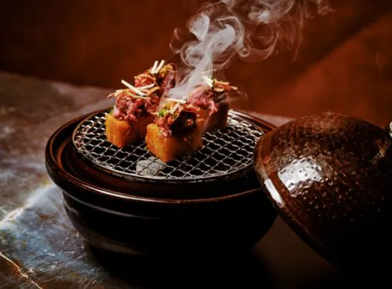 Kauboi's menu is designed for sharing and showcases a variety of dishes, including nigiri, sushi, skewers, steaks, and wood-fired vegetables. Desserts and cocktails are crafted with attention to detail, using authentic Japanese ingredients and seasonal flavors. The presentation of dishes, such as the Smoking Bluefin Tuna, adds a theatrical element to the dining experience.
