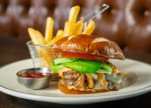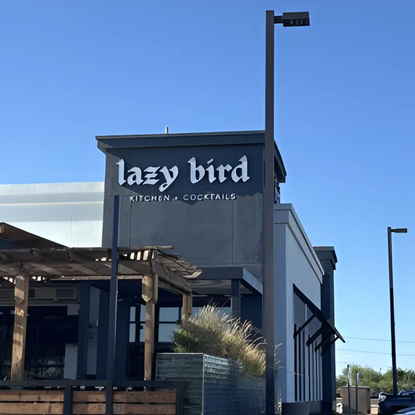 The atmosphere at Lazy Bird Kitchen & Cocktails is warm, contemporary, and effortlessly cool, combining upscale design with a laid-back vibe. The interior features rich wood tones, soft lighting, and sleek black-and-gold accents that create a modern yet inviting feel. Plush booths, a polished bar with handcrafted cocktails on display, and stylish art pieces give the space a refined touch without feeling pretentious. Large windows and an open layout make the dining room feel bright and social, while the spacious patio—complete with cozy seating and ambient lighting—offers a relaxed spot for evening cocktails or weekend gatherings. Overall, Lazy Bird strikes the perfect balance between trendy and comfortable, making it just as fitting for a casual dinner as it is for a lively night out.