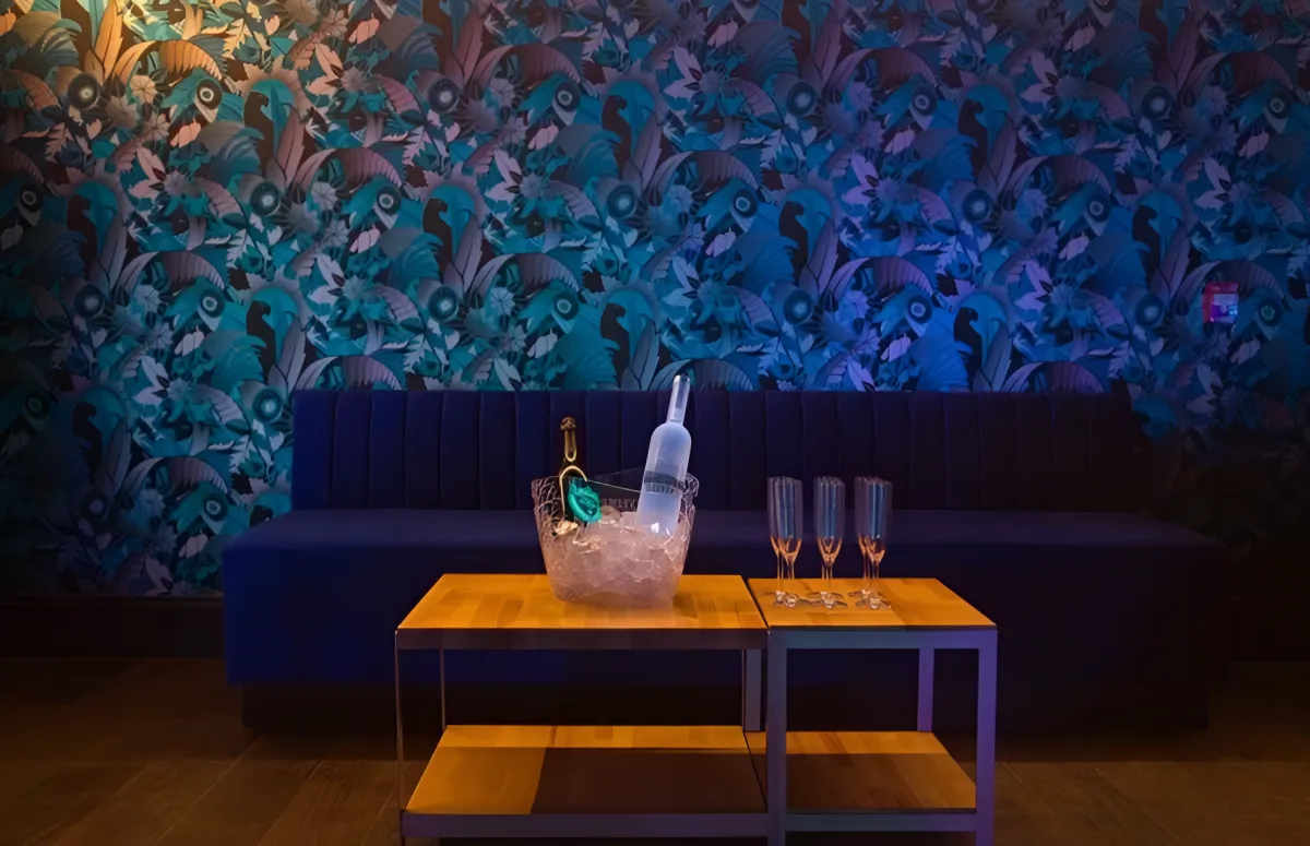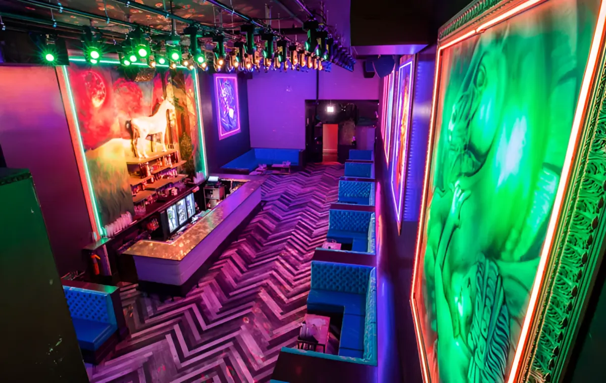 LiqrBox presents a bold, neon-infused aesthetic that combines elements of street art with opulent design. The venue features exposed brick walls adorned with collage-style murals, juxtaposed with Renaissance-inspired portraits and geometric patterns. This fusion creates a playful yet sophisticated ambiance, inviting guests to explore its vibrant spaces. The club's design captures the dichotomy of chaos and control inherent in nightlife, balancing eclectic art with tailored patterns, resulting in an energy that celebrates the vitality of Chicago and offers guests a unique experience with each visit.