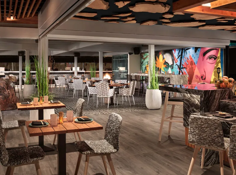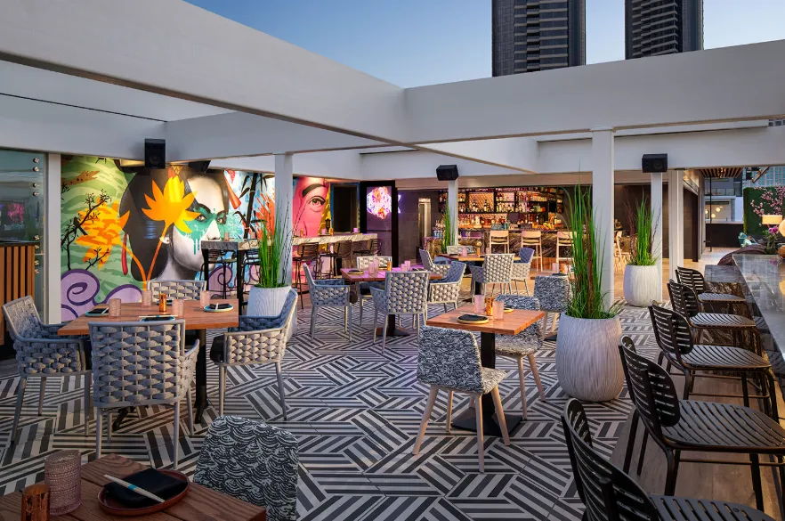 Lumi Rooftop in San Diego offers a dynamic and upscale atmosphere that seamlessly blends traditional Japanese design with modern flair. Situated atop the historic Grand Pacific Hotel in the Gaslamp Quarter, the 5,000-square-foot space features a striking combination of organic materials and contemporary elements. The outdoor bar is crafted from large granite boulders, while the ceiling above the enclosed bar boasts raw wood planks, and the rooftop is adorned with live greenery, paying homage to nature.