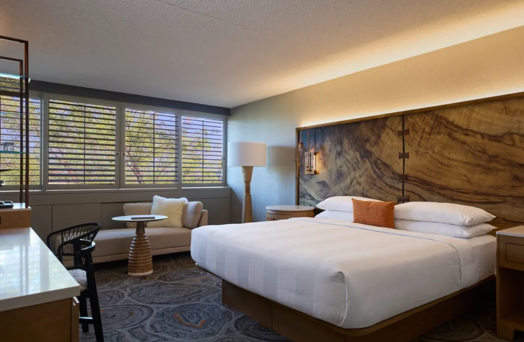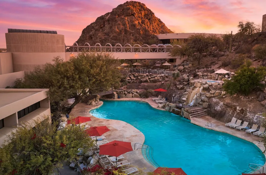 Nestled into the desert terrain of Tempe Butte, this resort offers a tranquil escape with sweeping 180-degree views—from downtown Tempe and Phoenix out to the Superstitions in the distance. The property recently completed a multi-million dollar renovation: all 353 guestrooms and suites (including studio, presidential, and chairman suites) have been upgraded with modern amenities.
