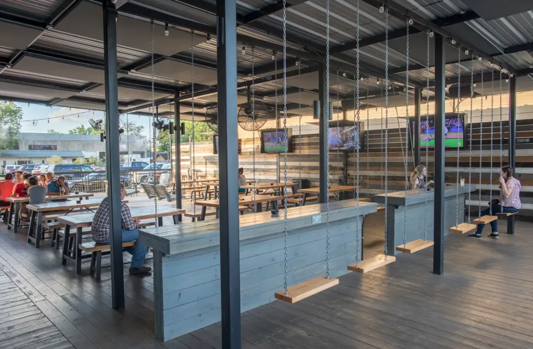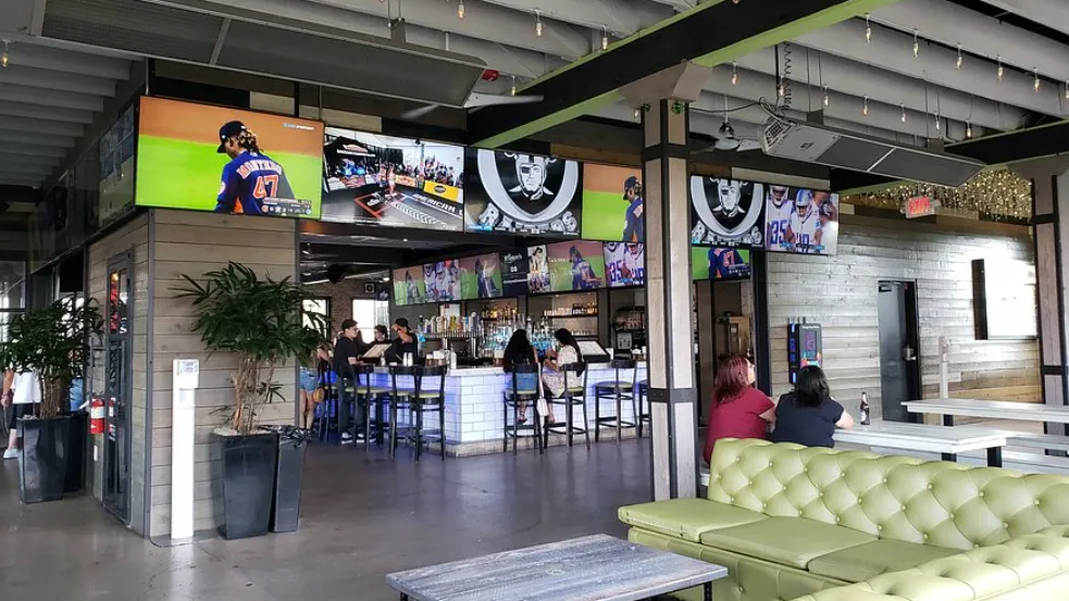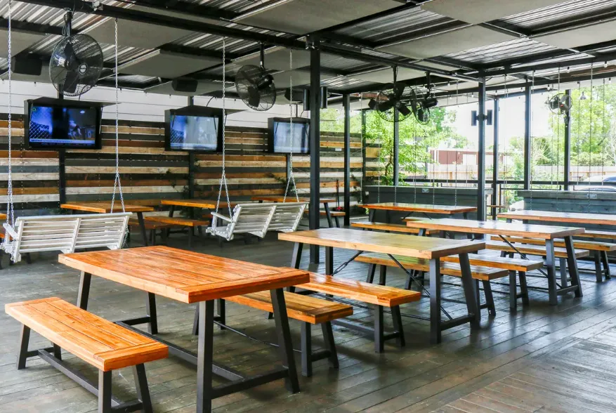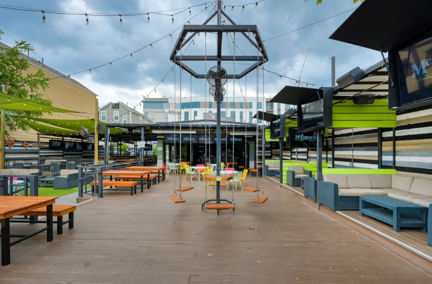 McIntyre’s Heights in Houston offers a vibrant, energetic atmosphere that blends the excitement of a sports bar with a stylish, modern design. Inside, birch wood–textured walls and a sleek marble bar create a warm yet upscale feel, while over 60 high-definition TVs — including a massive 187‑inch LED wall — make it a haven for sports fans. The space extends outdoors to a spacious, dog-friendly patio filled with colorful seating, porch swings, and a playful swing set, giving it a relaxed, social vibe. Covered and open-air seating areas make it inviting in any weather, while the lively crowd and interactive touches, like a basketball arcade game, add to its dynamic and engaging character.
