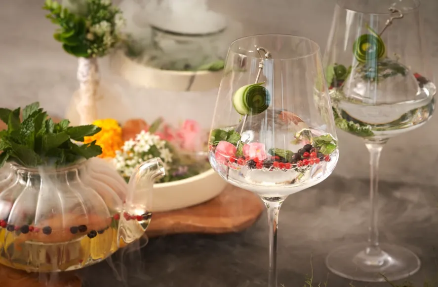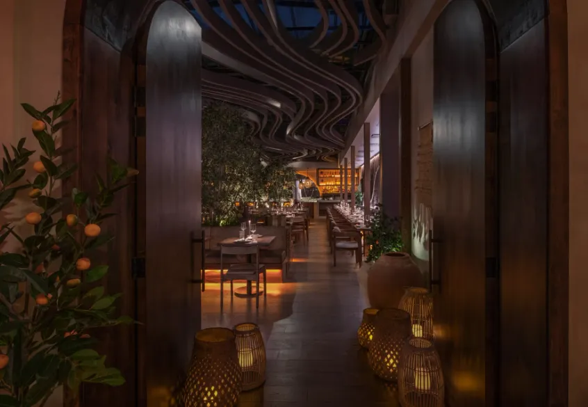 The 8,870-square-foot space, formerly Provocateur, features three distinct dining areas, including a private mezzanine and a glass-enclosed atrium. The interior is adorned with lush foliage, vaulted ceilings, and natural wood accents, creating a warm and inviting atmosphere.