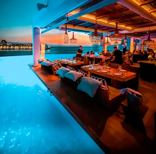 Meraki Mykonos, nestled within the luxurious Cavo Tagoo Hotel, offers a refined blend of Greek-Mediterranean cuisine, breathtaking Aegean views, and an immersive dining experience. The restaurant's design captures the essence of Mykonos' Cycladic charm, featuring minimalist aesthetics, open-air terraces, and an inviting infinity pool that sets the stage for both daytime relaxation and evening elegance.