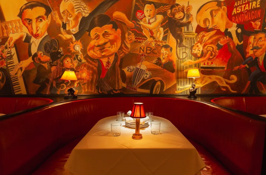 Monkey Bar exudes a blend of classic sophistication and playful charm, offering an atmosphere that feels both timeless and lively. The design channels Old Hollywood glamour, with dim, warm lighting that creates an intimate mood, plush red banquettes for luxurious comfort, and rich dark wood accents that evoke elegance. A standout feature is the large, whimsical mural depicting New York City icons such as Frank Sinatra and Fats Waller, adding personality and a sense of history to the space. Subtle monkey-themed décor elements give the lounge its unique identity, while the overall layout—combining a bustling bar area with refined dining sections—makes it equally suited for a glamorous night out, a romantic dinner, or a festive gathering.