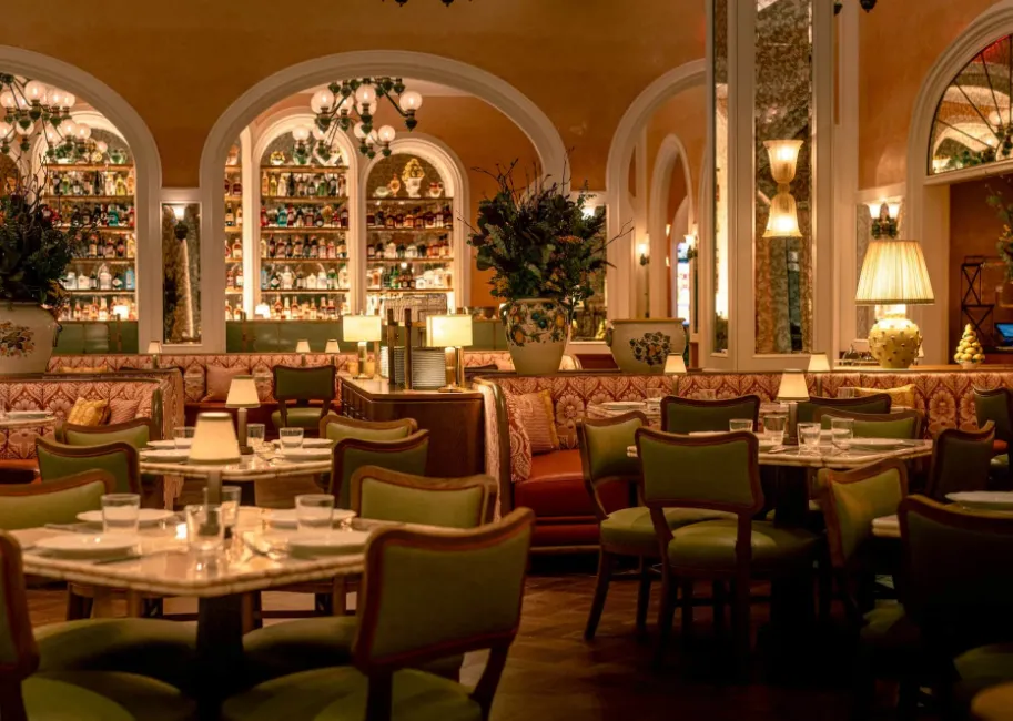 Mother Wolf Las Vegas, located within the Fontainebleau resort, offers a captivating dining experience that seamlessly blends Roman-inspired elegance with contemporary luxury. Designed by the renowned Martin Brudnizki Design Studio, the restaurant features arched colonnades, decorative floor tiles, and plant-filled ceramic urns atop sage-green banquettes, evoking the spirit of ancient Rome. The interior is adorned with hand-blown Murano glass chandeliers, Italian terrazzo flooring, damask walls, and custom antique mirrors, creating a warm and inviting atmosphere.