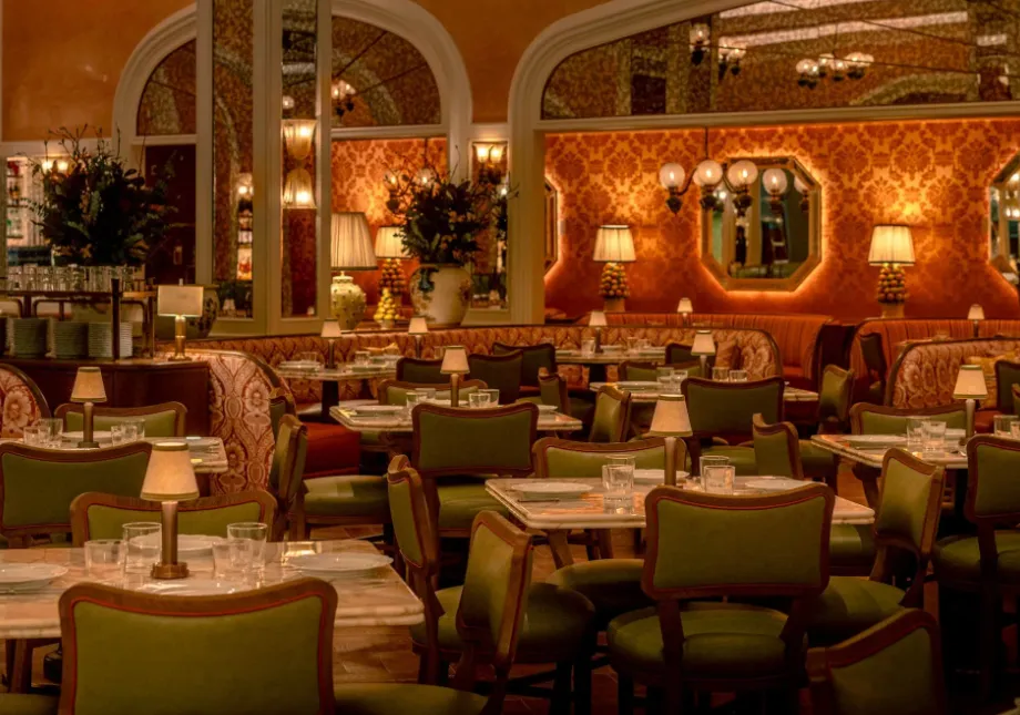 Mother Wolf Las Vegas offers a dynamic and engaging atmosphere that seamlessly blends Roman-inspired elegance with contemporary flair. The restaurant's design features arched colonnades, decorative floor tiles, and plant-filled ceramic urns atop sage-green banquettes, evoking the spirit of ancient Rome. Hand-blown Murano glass chandeliers, Italian terrazzo flooring, damask walls, and custom antique mirrors further enhance the ambiance, creating a warm and inviting setting for guests. The open kitchen, anchored by a wood-fired hearth, serves as a focal point, allowing diners to witness the artistry behind each dish. This combination of classic Roman elements and modern design creates a unique and memorable dining experience at Mother Wolf.