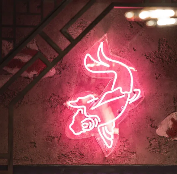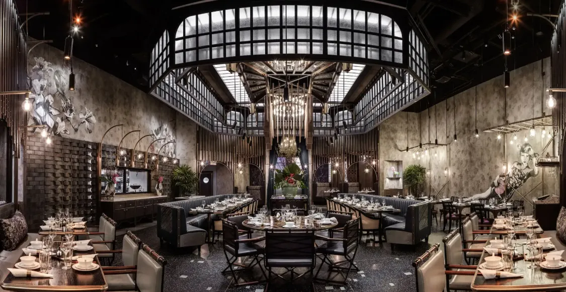 Designed by Joyce Wang Studio, Mott 32's interior combines industrial New York elements with traditional Chinese aesthetics. The space features a striking chandelier, neon lighting, silk-embroidered wall coverings, and antique Chinese coin-patterned table tops, creating a dramatic and immersive dining environment.