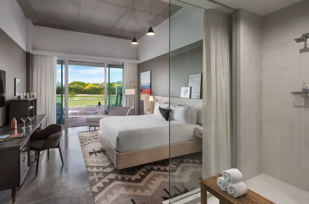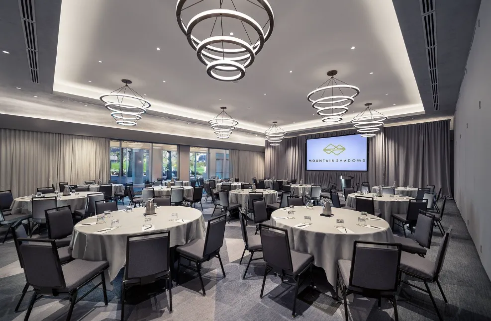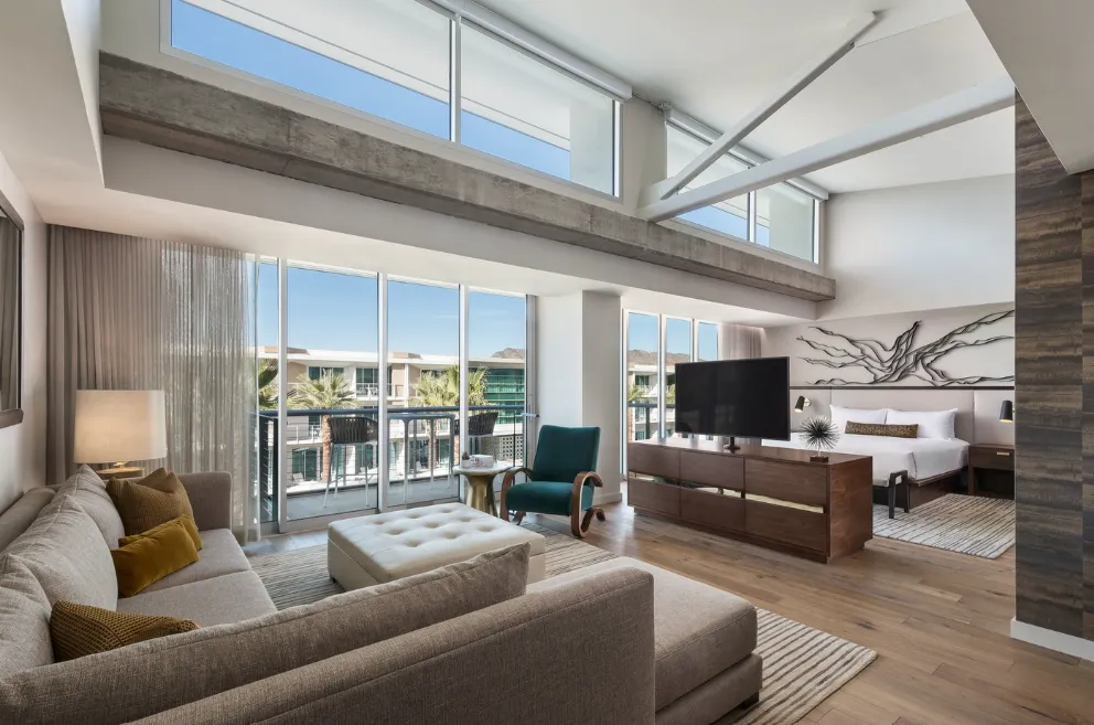 Mountain Shadows Resort Scottsdale offers a contemporary and stylish atmosphere, seamlessly blending mid-century modern design with the natural beauty of the Arizona desert. The resort's interiors, designed by the New York-based firm MARKZEFF, feature clean lines, minimalist aesthetics, and a neutral color palette, creating a serene and inviting environment. Large windows throughout the property frame breathtaking views of Camelback Mountain, allowing guests to feel connected to the surrounding landscape.