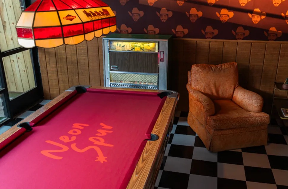 Neon Spur Tempe delivers a nostalgic yet vibrant atmosphere, blending the charm of a 1970s Western dive bar with modern nightlife energy. Its design embraces retro flair, featuring vintage furniture, warm wood accents, colorful neon signage, and a classic jukebox that instantly transports guests to another era. The dim, inviting lighting creates a cozy and laid-back vibe, while the open layout and rustic décor encourage socializing and fun. Whether filled with the hum of conversation, live music, or themed events, Neon Spur offers a playful, immersive environment that feels both timeless and distinctively rooted in Tempe’s nightlife culture.