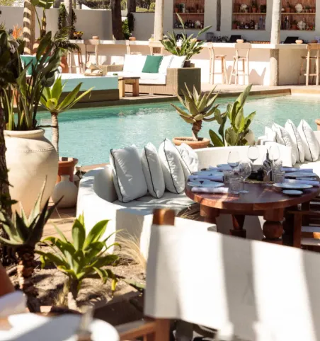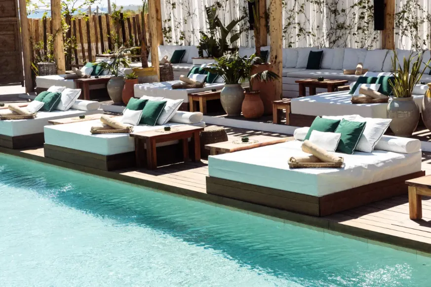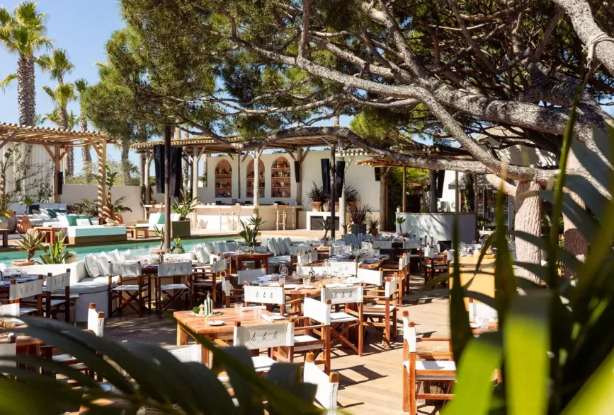 Nikki Beach Saint-Tropez boasts an elegant yet laid-back ambiance, characterized by its signature all-white décor, plush daybeds, and a serene pool area surrounded by palm trees. The design seamlessly blends nature's elements with contemporary elegance, creating a serene yet luxurious atmosphere. The outdoor dining area, nestled beneath large trees and pergolas, invites guests to relax in a tranquil, shaded setting. Wooden furnishings adorned with plush white cushions and surrounded by vibrant greenery enhance the natural charm, offering a perfect escape.