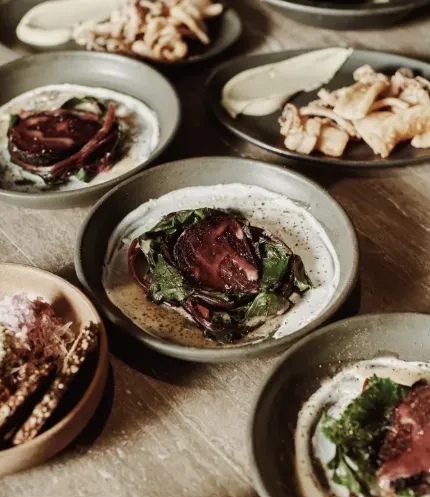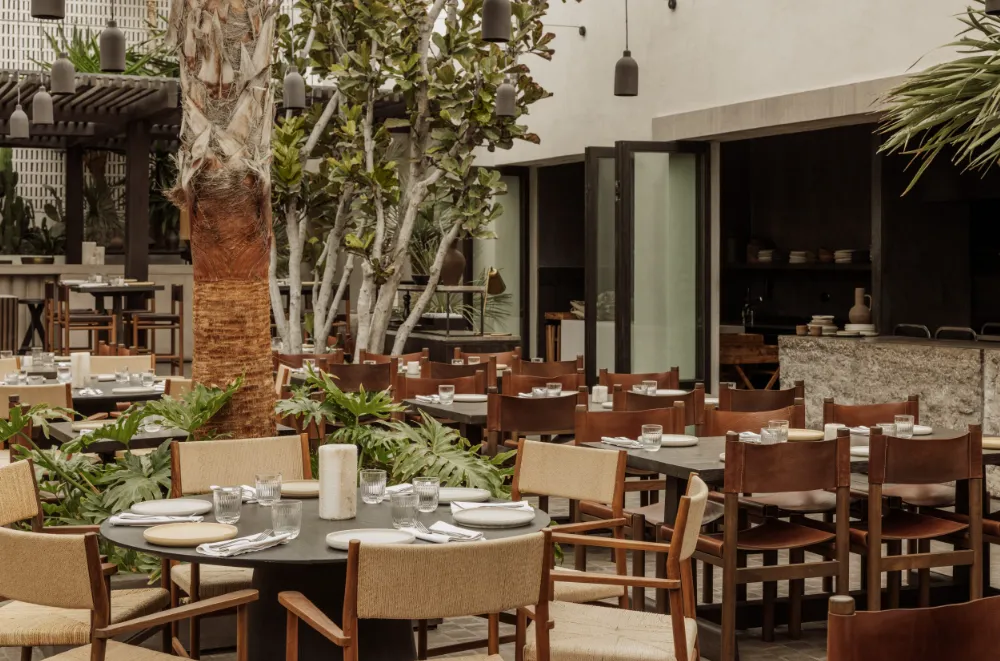 Nōema transforms into a vibrant nightlife venue after dinner service, featuring DJs spinning vinyl under olive trees in the courtyard. The venue offers a dynamic atmosphere where guests can enjoy music, cocktails, and dancing into the early hours.
