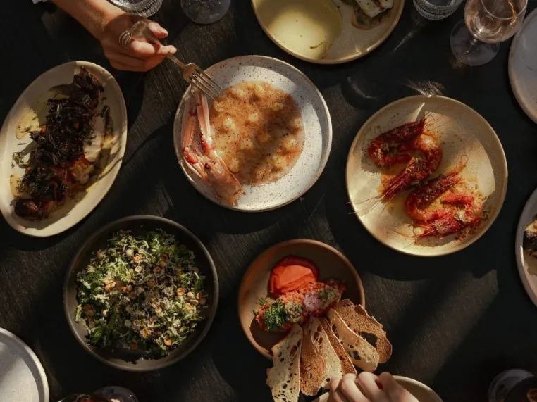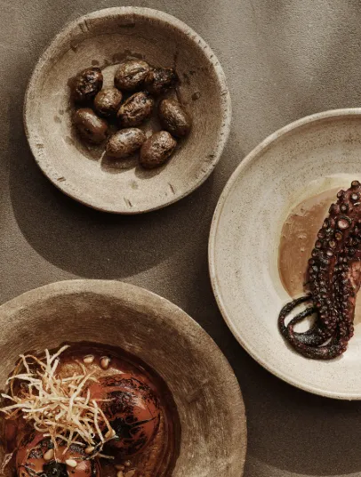 The menu at Nōema focuses on season-conscious pescatarian and vegetarian dishes, utilizing locally sourced ingredients. Culinary Director Athinagoras Kostakos crafts dishes that highlight the raw, sun-baked flavors of the Cyclades.