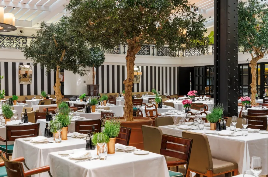 Novikov Restaurant & Bar in London exudes a refined yet vibrant atmosphere, seamlessly blending luxury with energy to create a dynamic social dining experience. The venue is divided into two distinct spaces — the Asian Room and the Italian Room — each designed with its own unique aesthetic. The Asian Room features an open kitchen and a dramatic seafood display reminiscent of a bustling market, accented by sleek dark wood, polished marble surfaces, and ambient lighting that highlights textures and details. The Italian Room offers a warmer, intimate setting with soft lighting, rich leather seating, and elegant touches that evoke Mediterranean charm. The adjoining Lounge Bar adds a modern, high-energy layer to the venue, with plush seating, mood lighting, and a contemporary design that encourages mingling. The combination of thoughtful decor, contrasting styles, and an upbeat ambiance makes Novikov both sophisticated and inviting.
