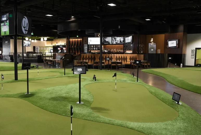 Putting World in Scottsdale offers a modern and immersive indoor putting experience, blending the precision of golf with a vibrant social atmosphere. The facility features an 18-hole putting course designed to mimic authentic greens, providing a realistic golfing experience. Strategically placed large-screen TVs enhance the ambiance, allowing guests to enjoy sports events while engaging in the game. The venue's design incorporates various seating options, including cozy lounge areas and high-top tables, creating a welcoming environment for both casual players and serious golfers. Private event spaces like the Anser Suites and the Karsten Club offer exclusive settings for groups seeking a more intimate experience. Overall, Putting World combines cutting-edge design with a lively atmosphere, making it a premier destination for indoor golf enthusiasts and social gatherings.