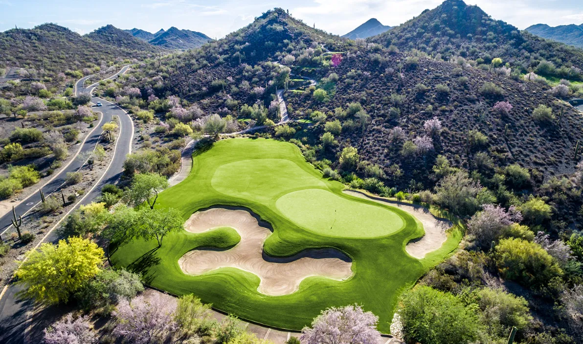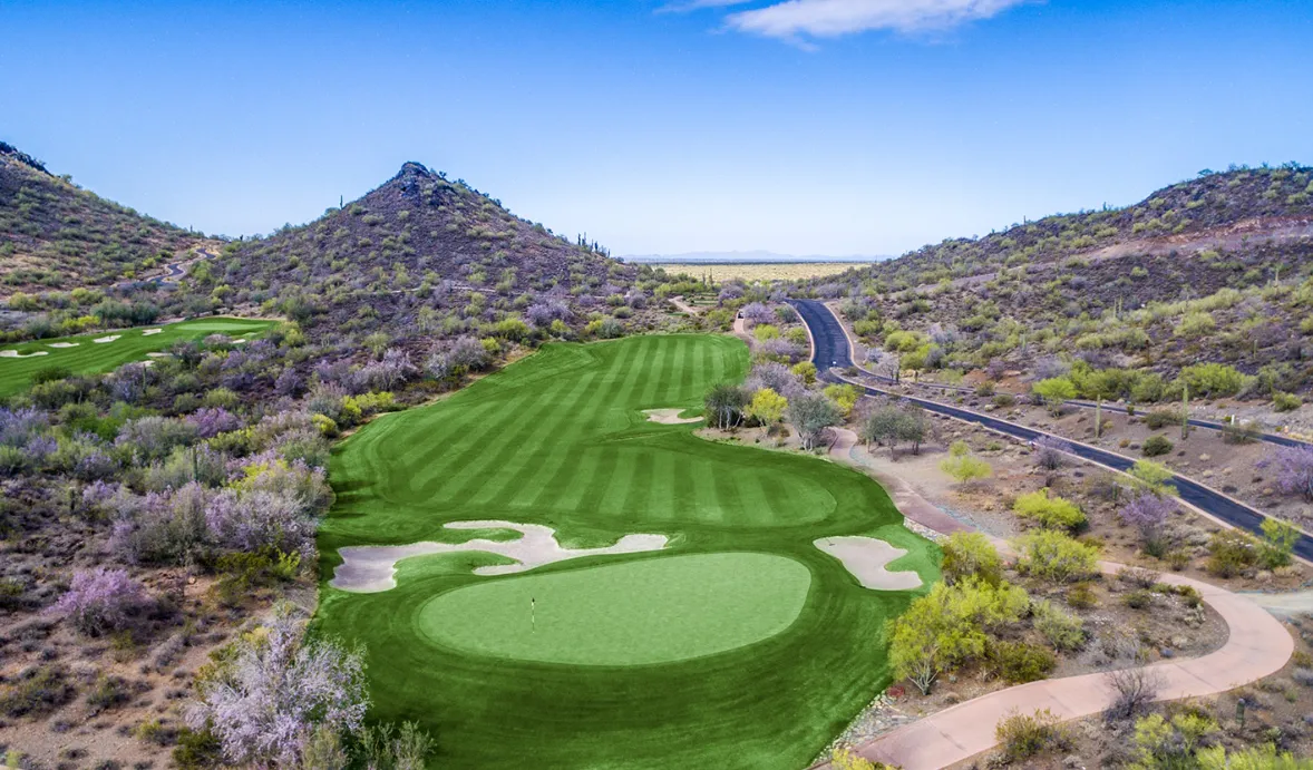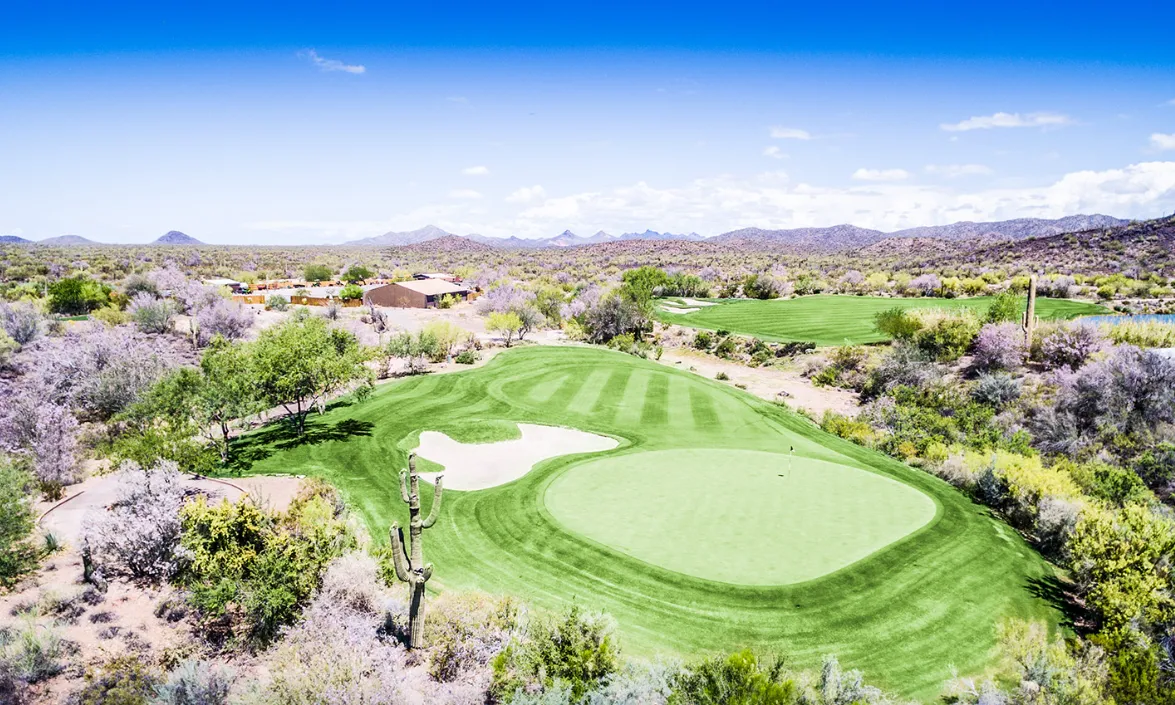 The atmosphere at Quintero Golf Club is both serene and dramatic, with a sense of seclusion created by its remote desert setting and panoramic views of the Hieroglyphic Mountains and Lake Pleasant. The design embraces the natural contours of the land, weaving wide fairways and elevated tee boxes through rolling desert terrain, accented by saguaros, rocky ridges, and deep arroyos. Rees Jones crafted the course to balance beauty with challenge, offering risk-reward holes, bold bunkering, and multi-tiered greens that demand precision while still allowing room for strategic play. The result is a layout that feels immersive and natural, with each hole presenting a unique visual and strategic experience in harmony with the desert landscape.