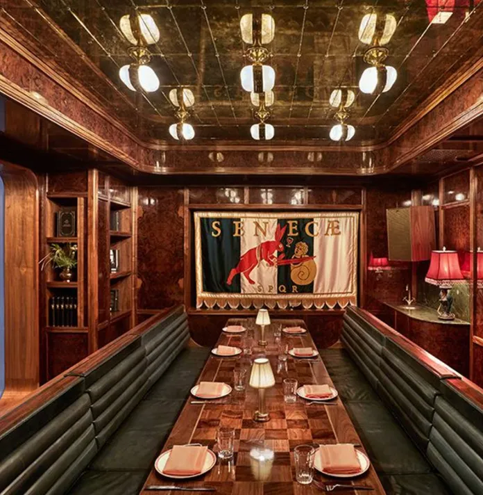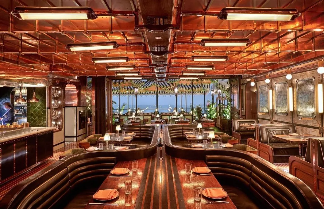 Seneca Trattoria offers a sophisticated dining experience atop the InterContinental Hotel in San Diego, blending nautical elegance with Roman-inspired design. Designed by AvroKO, the restaurant features glossy wood floors reminiscent of a luxury yacht, a central 1940s-style banquette, and a private dining room inspired by a captain’s quarters, complete with a porthole window. The space is adorned with intricate resin artwork and custom tassels, enhancing the maritime theme. A sweeping copper ceiling and tasseled furniture add to the ambiance, while an open kitchen allows guests to observe the culinary team at work. The layout includes lush greenery and striped awnings, creating a chic and vibrant atmosphere that complements the stunning views of the North San Diego Bay.
