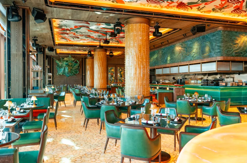 The design features rich materials such as Esmeralda onyx marble from Iran, creating a tactile and visually captivating environment. The layout includes bi-fold doors for al fresco dining, a complex veneered ceiling with recessed coffers, and bespoke seating arrangements that contribute to the restaurant's dramatic and glamorous atmosphere.