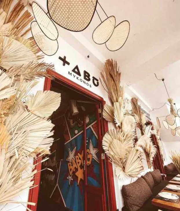 Tabu Mykonos boasts a chic and stylish interior, featuring contemporary decor that blends seamlessly with the island's traditional Cycladic architecture. The venue is designed to provide an intimate yet energetic setting, with state-of-the-art lighting and sound systems that enhance the overall experience. An outdoor terrace offers guests the opportunity to enjoy cocktails and shisha under the stars, adding to the club's allure.