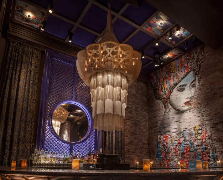 Designed by the Rockwell Group, TAO Downtown exudes a dramatic, Asian-inspired aesthetic characterized by towering columns, hand-carved accents, and ambient lighting. Multiple layers of light, including hundreds of candles, reveal architectural details and create a captivating environment that guides guests through various spaces, providing a soft layer of light throughout.